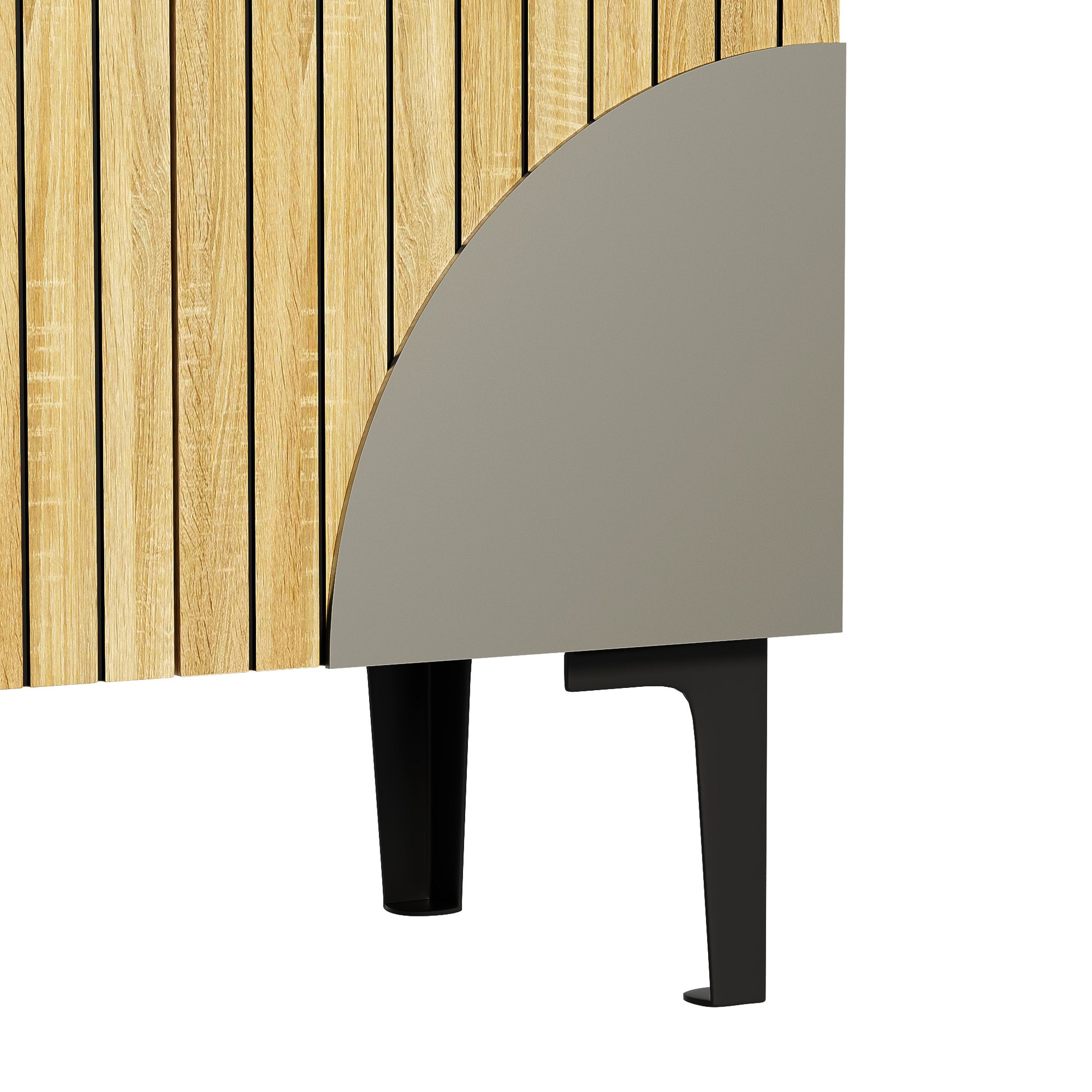 Its light wood tone is perfectly complemented by sturdy black PVC legs, creating a modern yet inviting contrast. The doors feature vertical lines and gray, semi-circular decorative elements for a stylish touch. Small, round black handles complete the harmonious look, making this shoe cabinet a highlight in any hallway, whether in a Scandinavian, modern, or Nordic style.