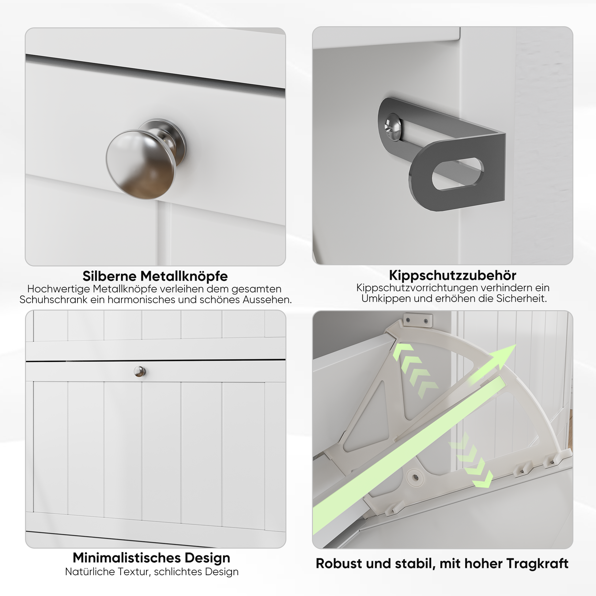 Made of high-quality P2 MDF, this shoe cabinet offers a long lifespan. The anti-tip device enhances safety, and the simple, elegant metal handle prevents scratches and injuries.