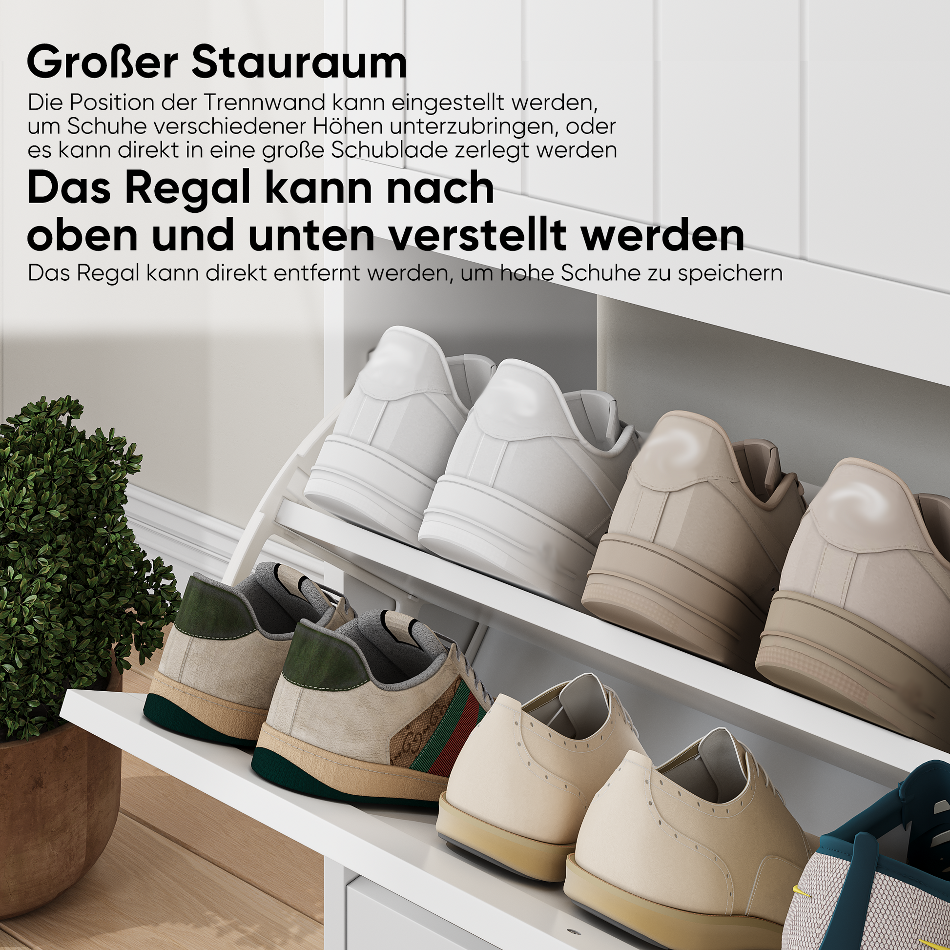 The shoe cabinet provides ample storage for 6-12 pairs of shoes. It features two drawers at the top and bottom, each offering two levels of storage. The drawer front can be adjusted in two slots or removed entirely to accommodate flats, ankle boots, or high heels of varying heights and sizes.