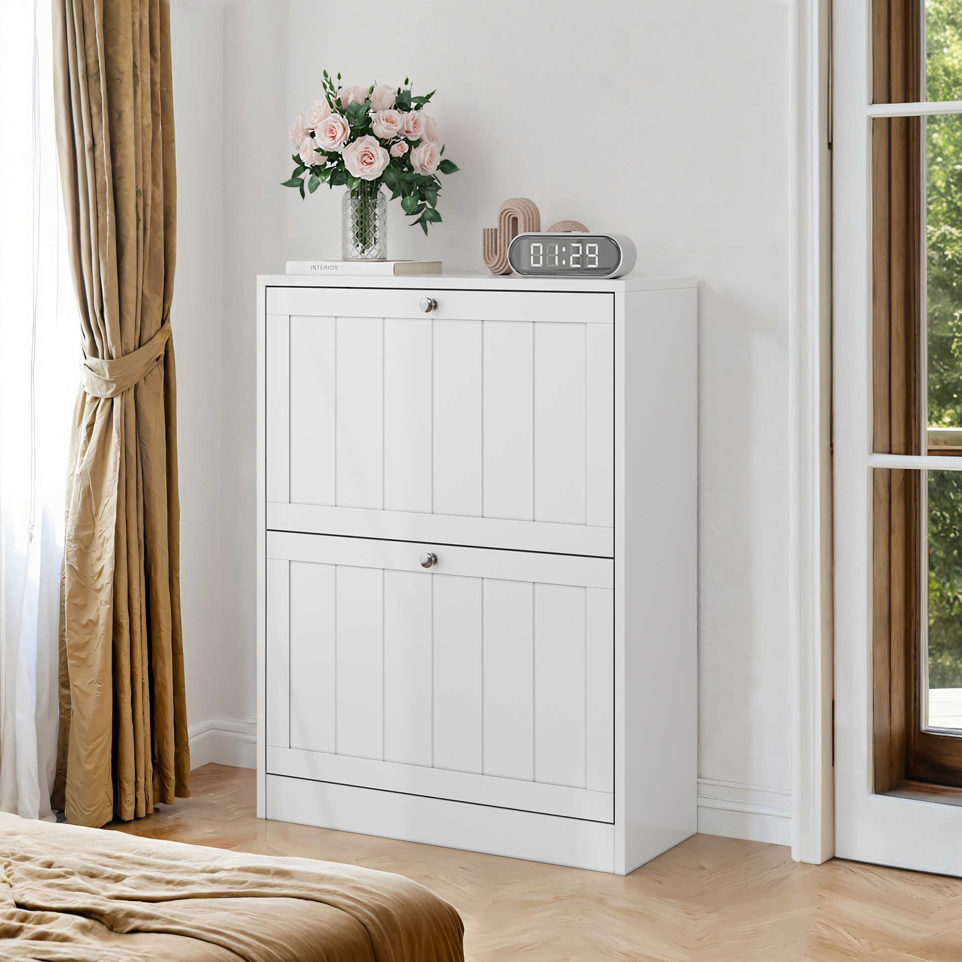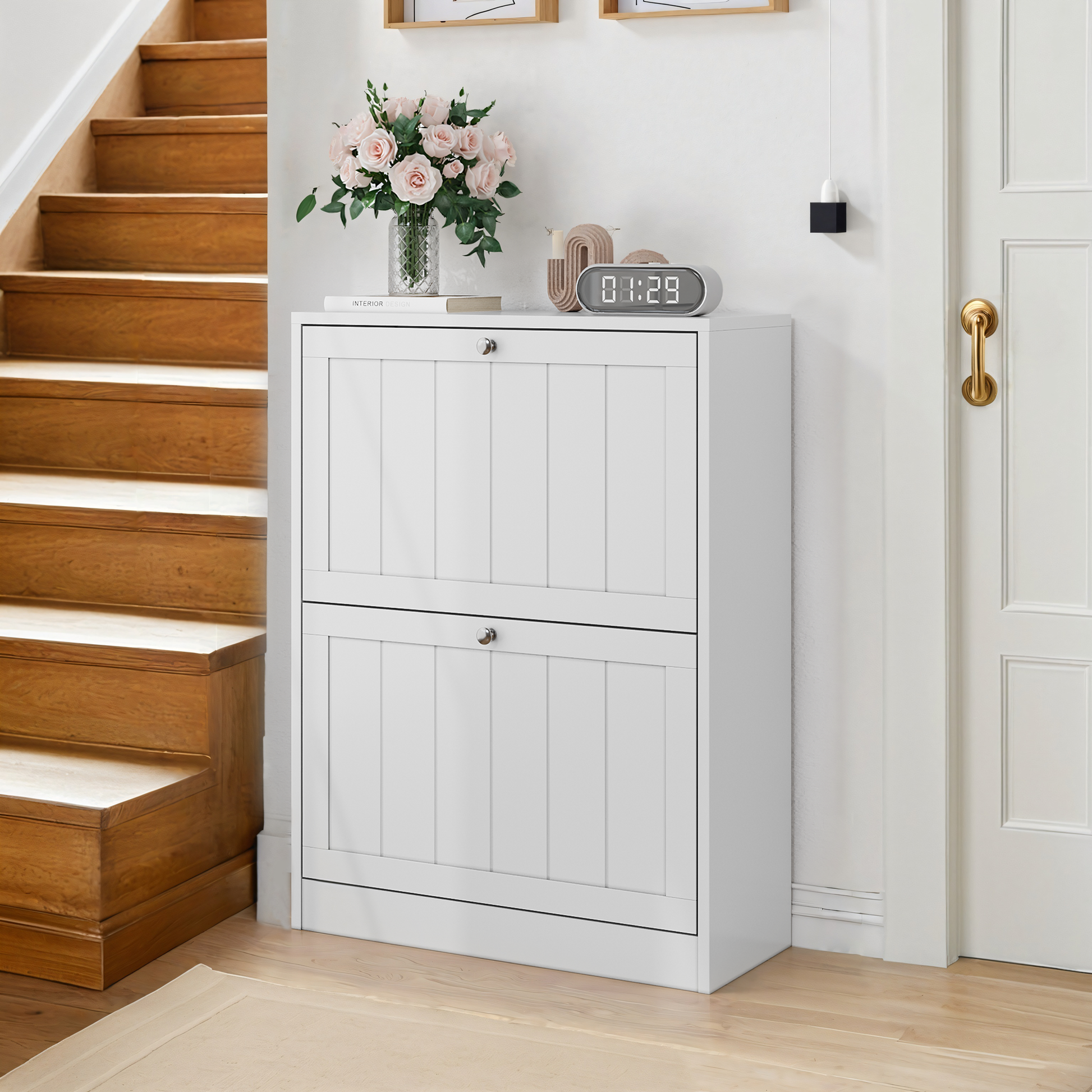 Shoe Cabinet, Freestanding Hidden 2 Drop-Down Drawers Mid-Century Modern White