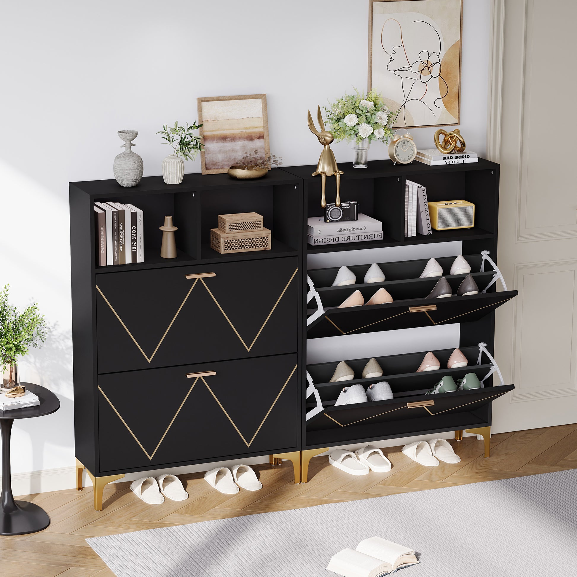 Shoe Cabinet with 4 Drop-Down Doors, 8 Compartments, 4 Semi-Open Shelves, Raised Legs, MDF + Metal