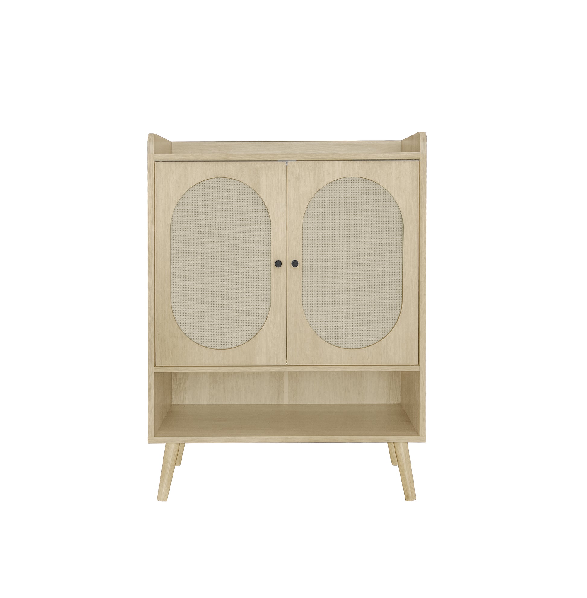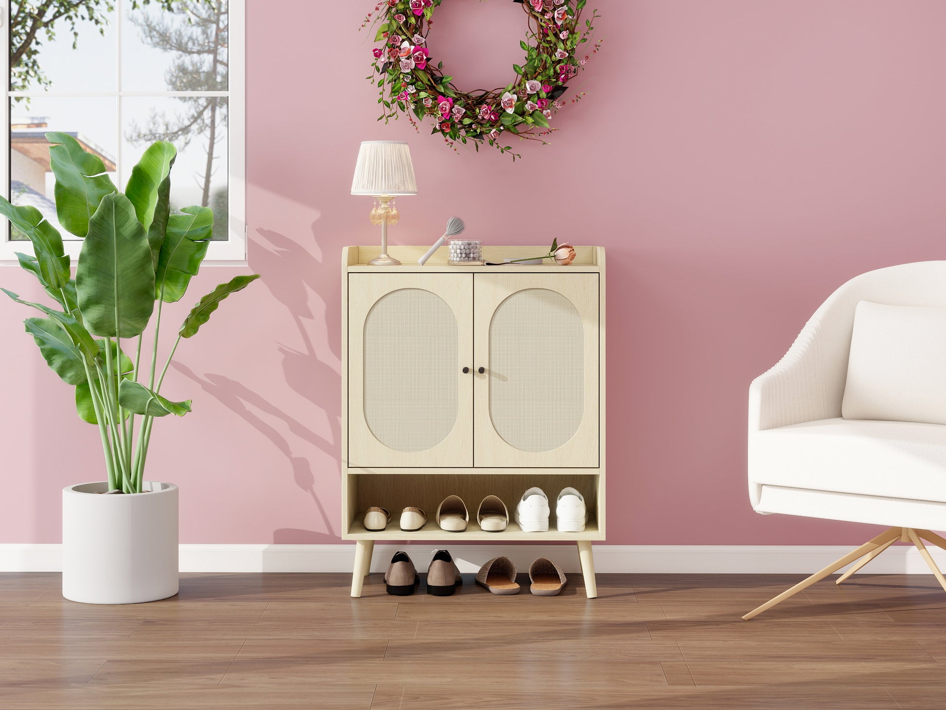 Shoe Cabinet with Double Doors, Storage & Open Shelf, Natural Rattan
