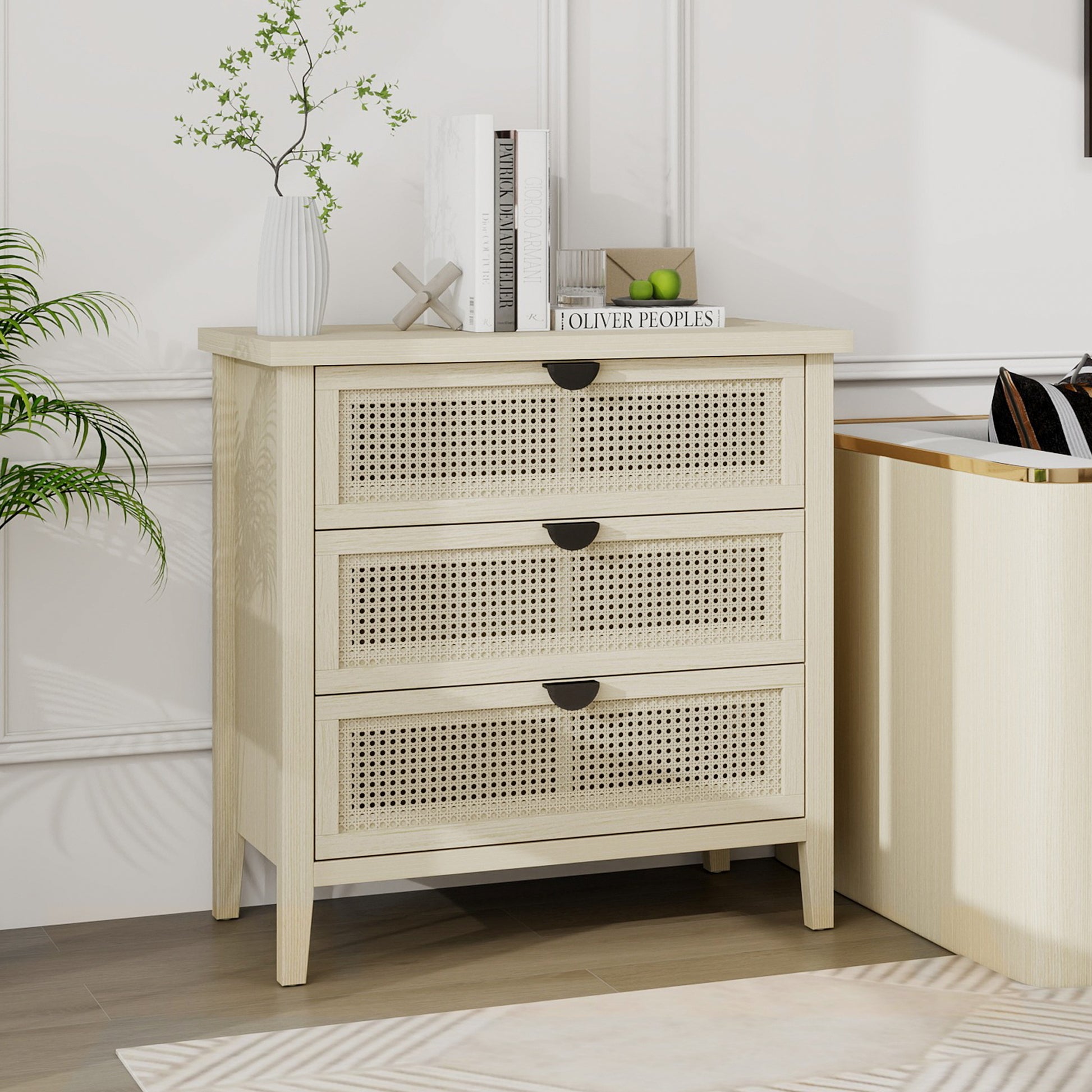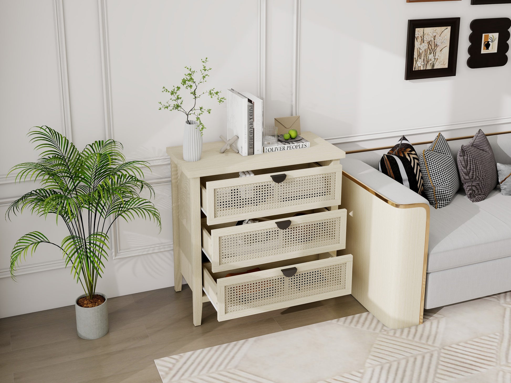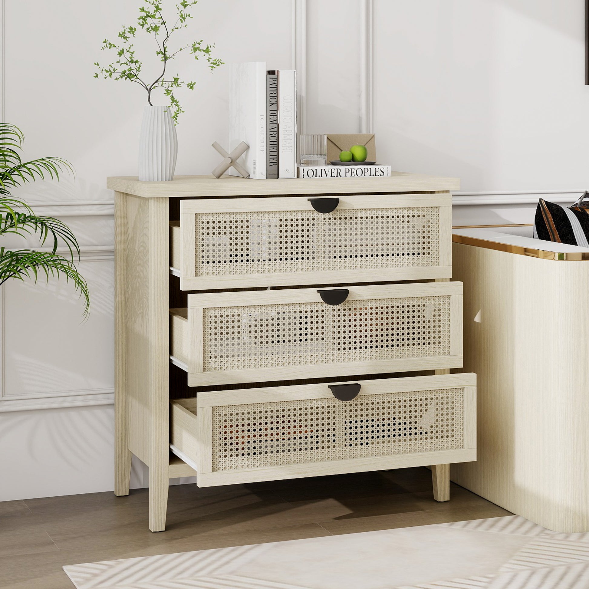 The drawer fronts are crafted with a honeycomb rattan weaving technique, offering good ventilation and breathability. Together with the semi-circular black metal handles, this creates a modern design that is ideal for various rooms such as bedrooms, living rooms, or home offices.