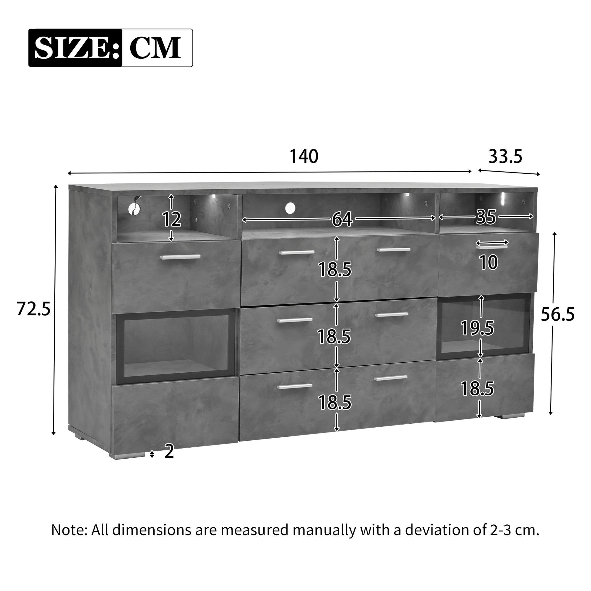 Sideboard, 140 cm LED Lighting, 2 Doors, 3 Drawers, Open Storage, Grey Acrylic