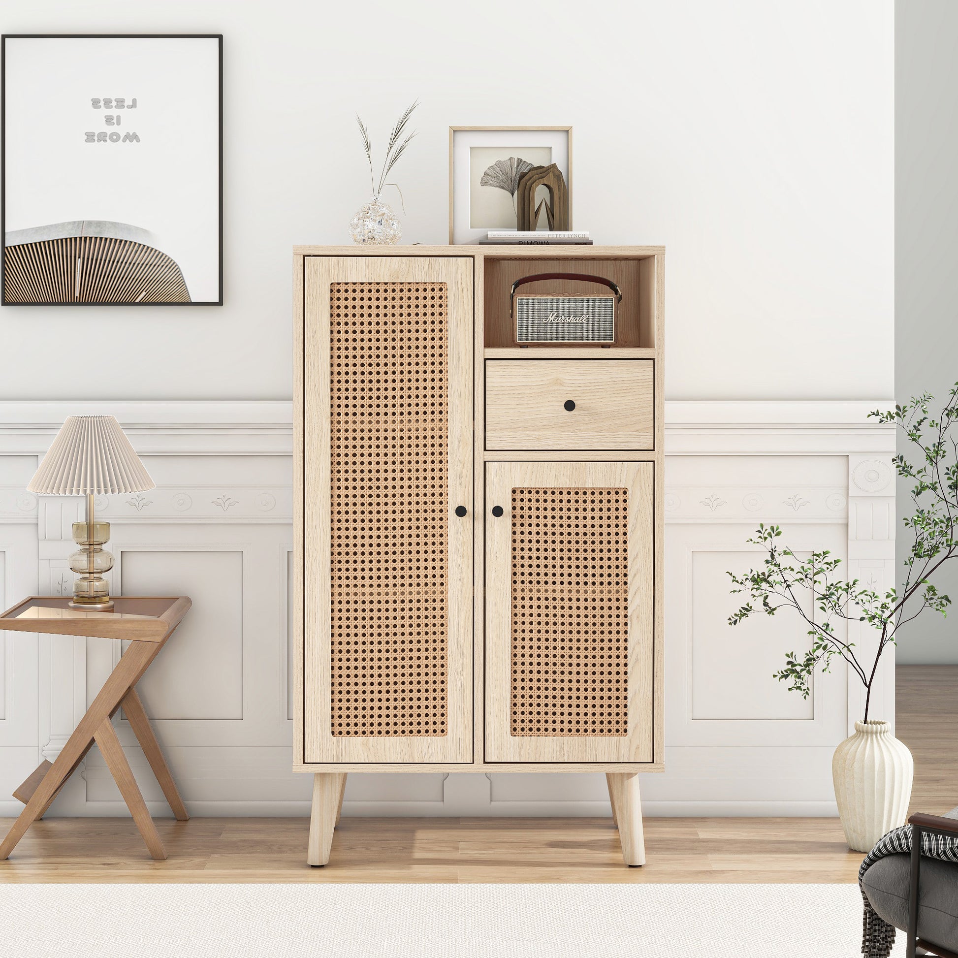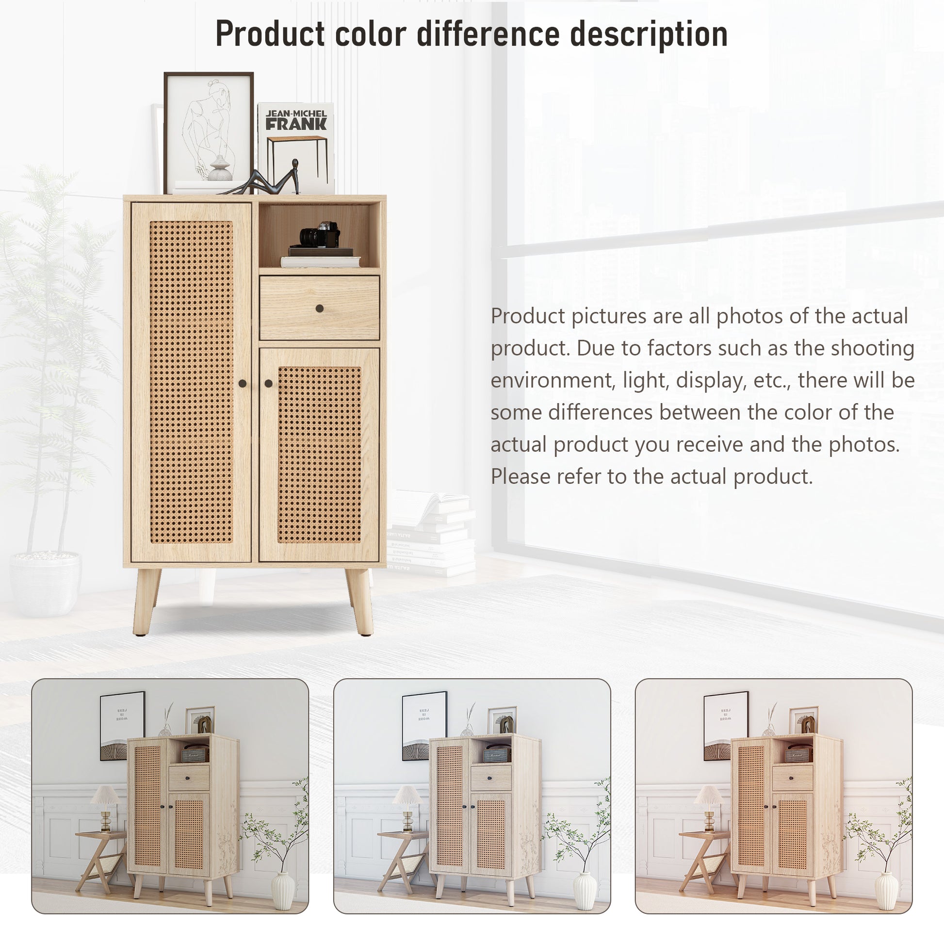 Stylish design: The solid wood color of the cabinet is matched with woven PE rattan to enhance the product's appearance and design.