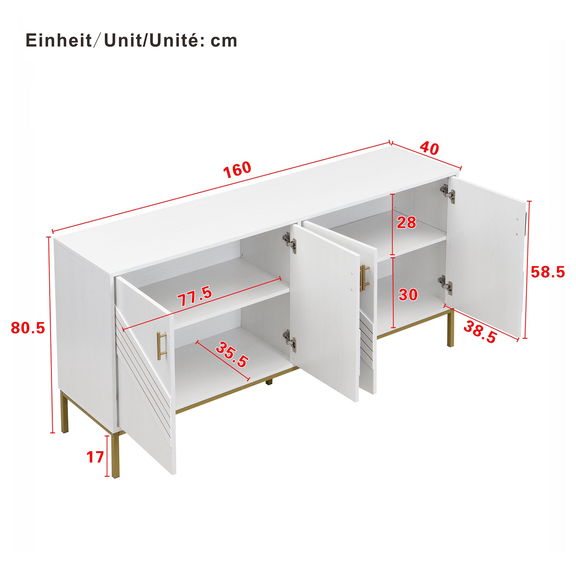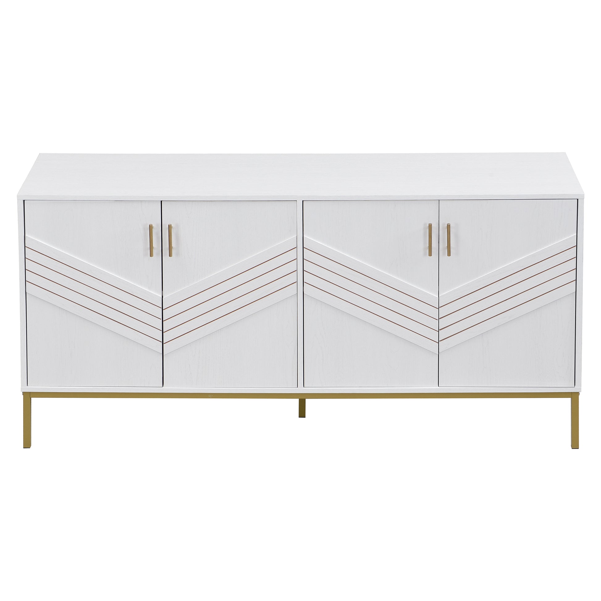 Sideboard, 4 Doors, Large Capacity, Height-Adjustable, White & Gold MDF