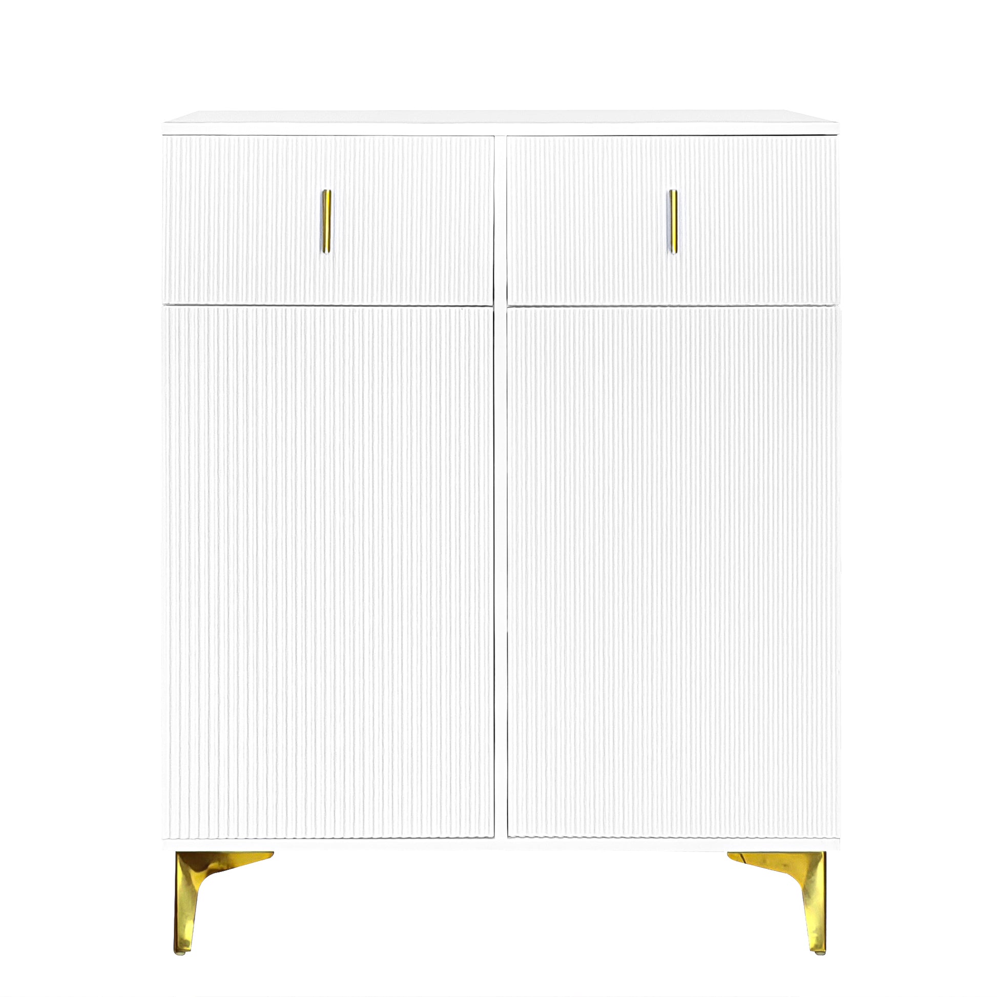 This elegant sideboard features a sophisticated design with two drawers and two doors, each adorned with textured paneling. Inside, two adjustable shelves offer customized storage options, making it suitable for use as a sideboard, shoe cabinet, or dressing table for a variety of living scenarios.