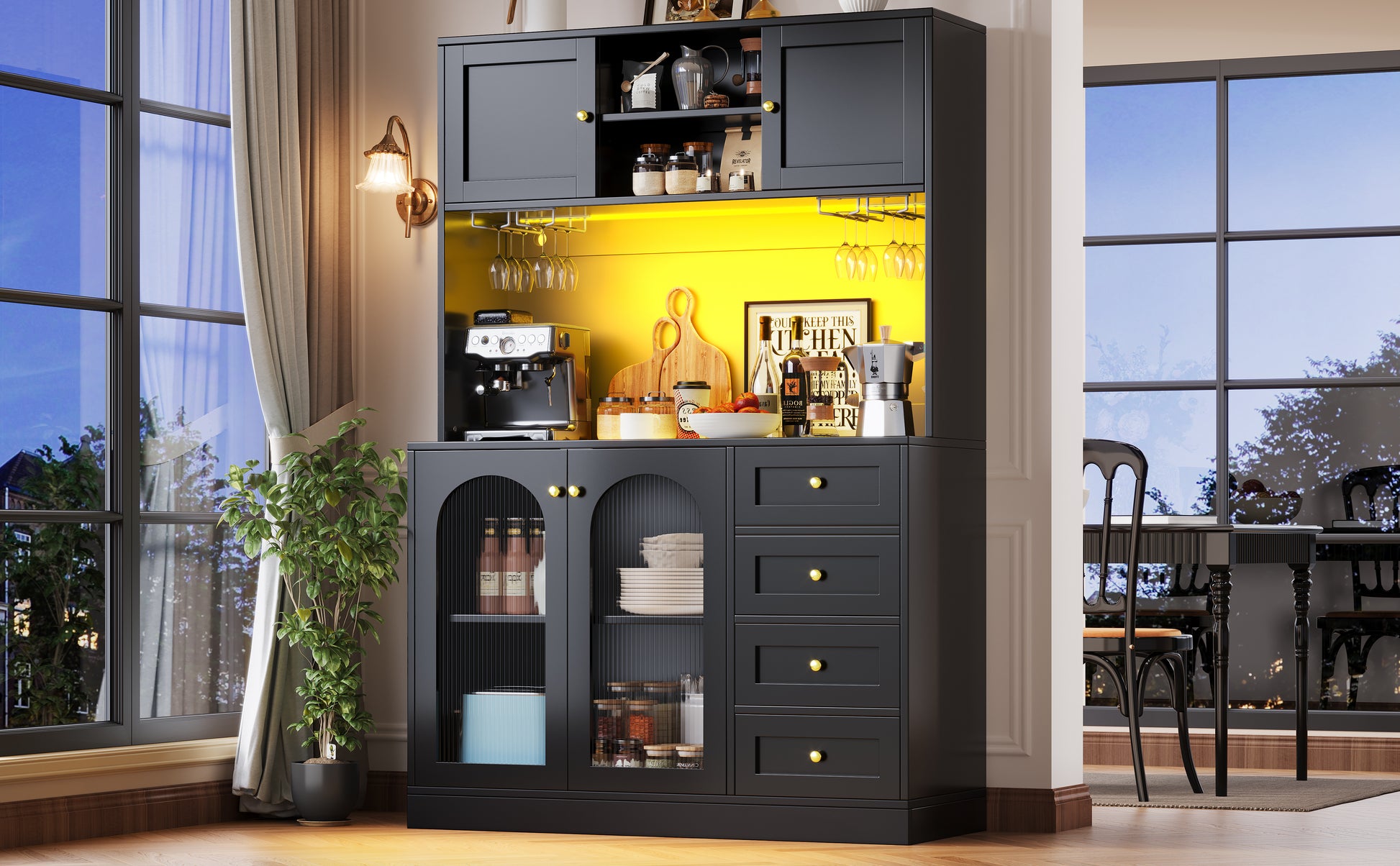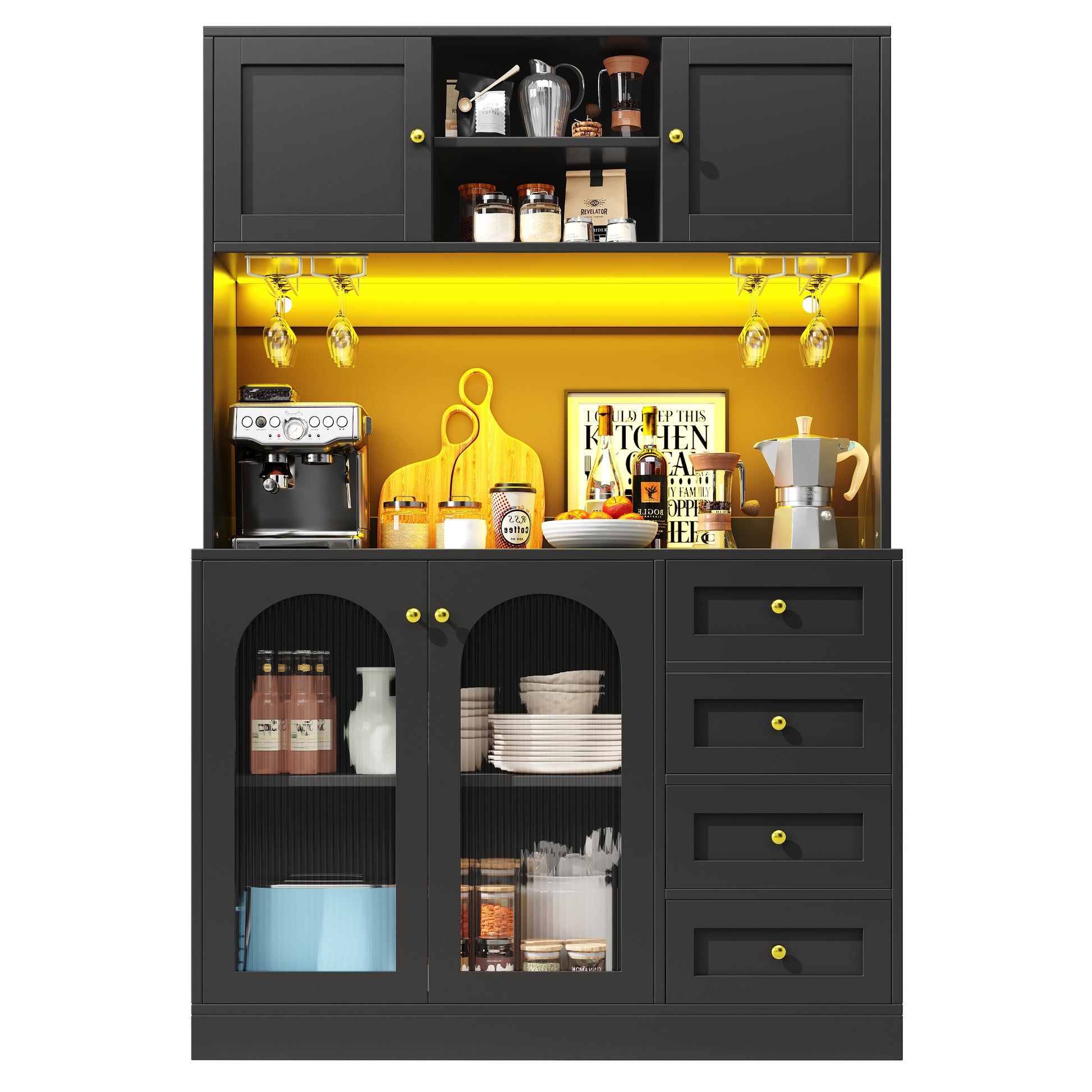 The cabinet is available in black and accented with exquisite gold-colored handles. Its doors feature fluted glass, which provides a retro-simple yet captivating look that blends seamlessly into any room. For modern convenience, an integrated LED light strip can be controlled via a smartphone app to adjust color, brightness, and more.