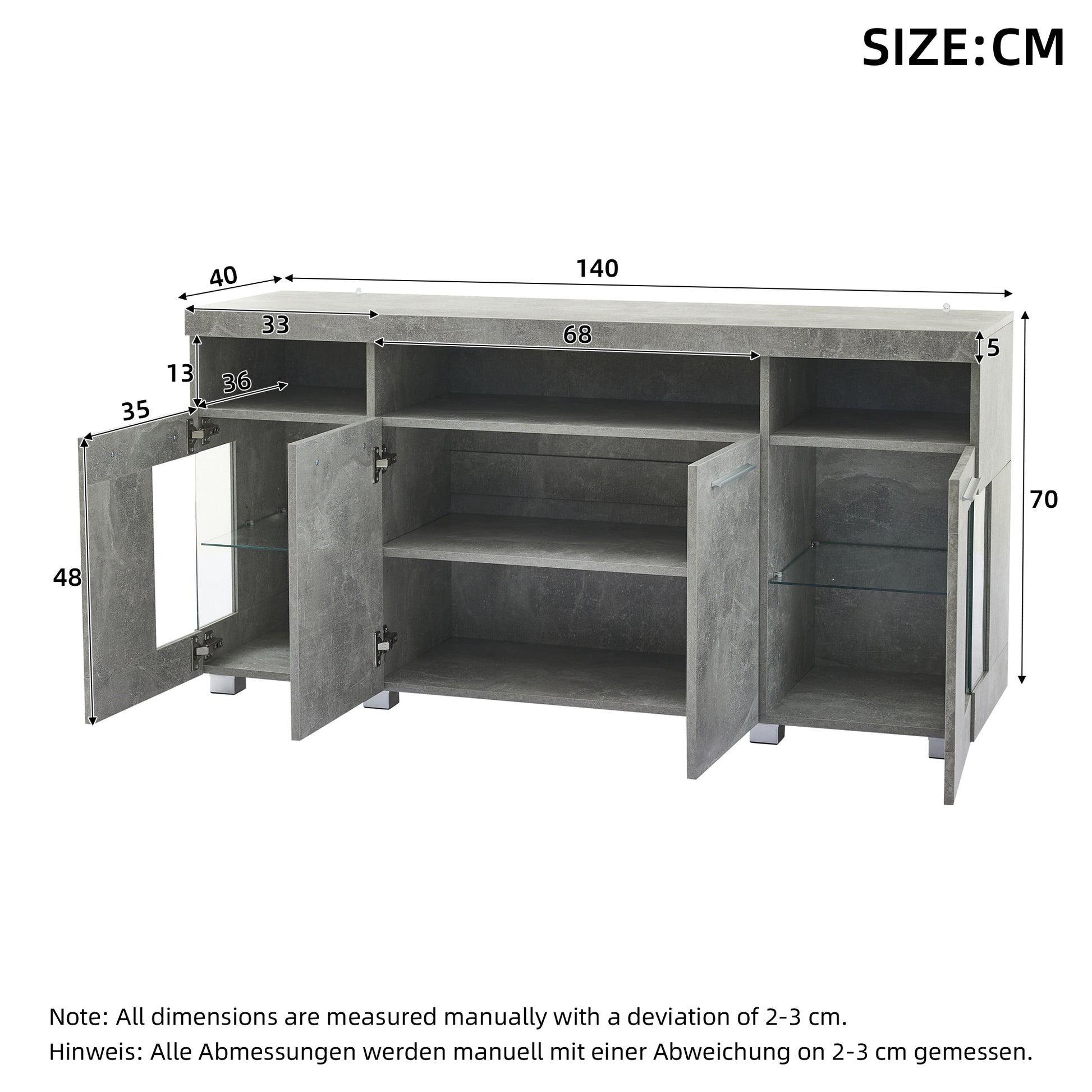 This modern, industrial-style living room sideboard features a high-gloss cement gray finish, paired with clear tempered glass doors and integrated LED lighting that creates a sophisticated look. Measuring 140 x 40 x 70 cm, it offers ample storage space with three large drawers, six shelves, and a semi-open shelving unit. The combination of carefully selected MDF and particleboard ensures robustness and durability, supporting up to 80 kg. The top platform provides secure storage for heavy items such as speakers. The unique industrial-style design blends seamlessly with various interior styles, such as modern and Nordic. The two packages will be shipped separately; please inspect them carefully. (Highlighting is limited to the cabinet doors.)
