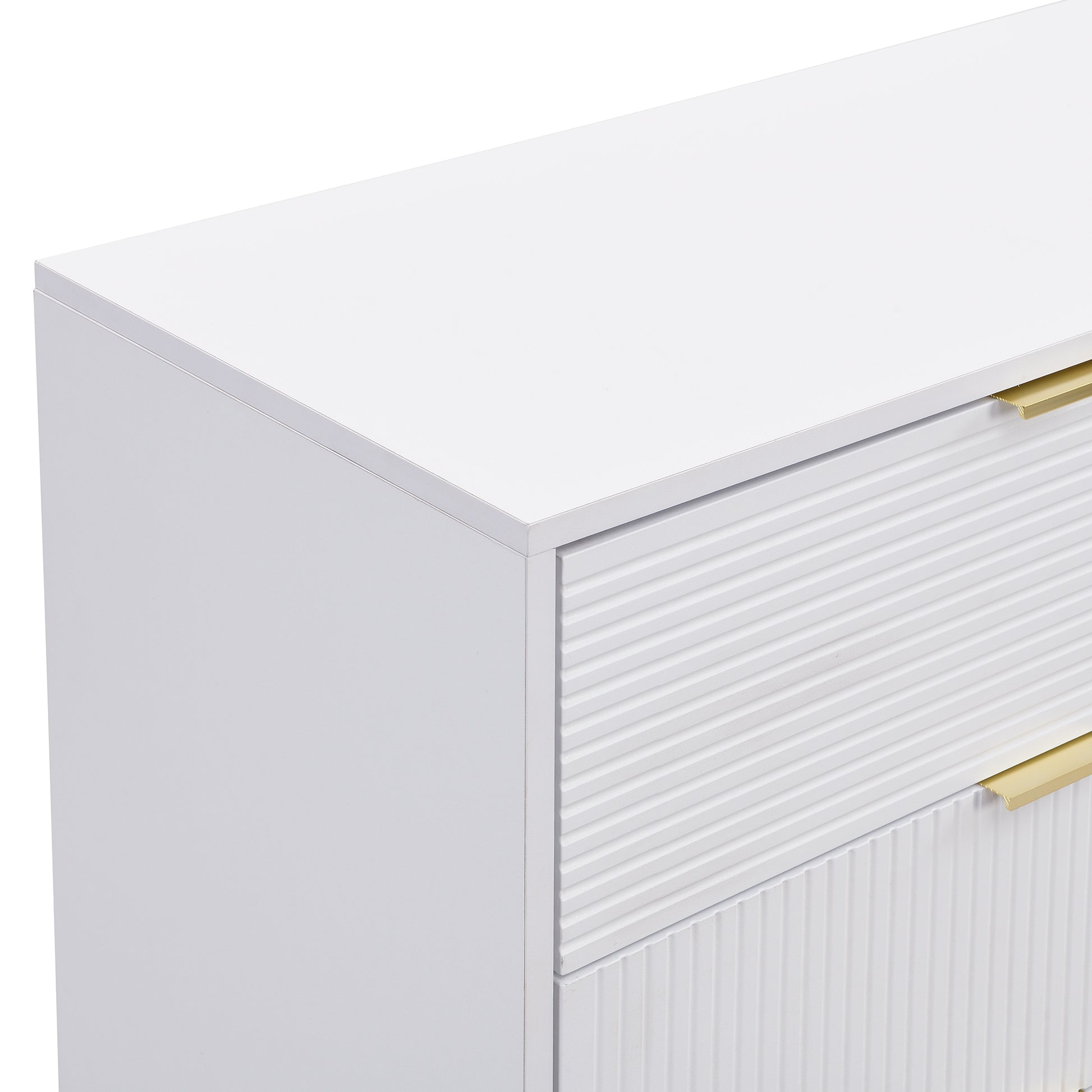 The design features a surface with a unique wave pattern, while the drawers feature offset lines that create a mesmerizing light and shadow effect, giving the piece a special tactile appeal. Golden legs and handles complete the look, lending the white body a touch of elegance and sophistication that seamlessly complements any decor.