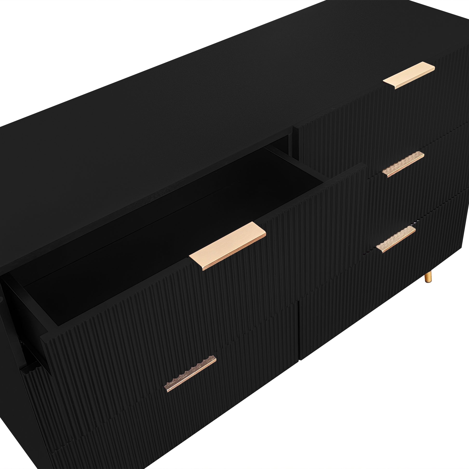 The dining room cabinet measures 120 cm wide, 77 cm high, and 40 cm deep, and stands on 15 cm high legs, making it easy to use with robot vacuums and cleaning tools. With six drawers, it offers generous storage space. The modern, minimalist design impresses with clean lines, a wave-like texture, and golden handles and legs, giving the cabinet an elegant and stylish look and feel.