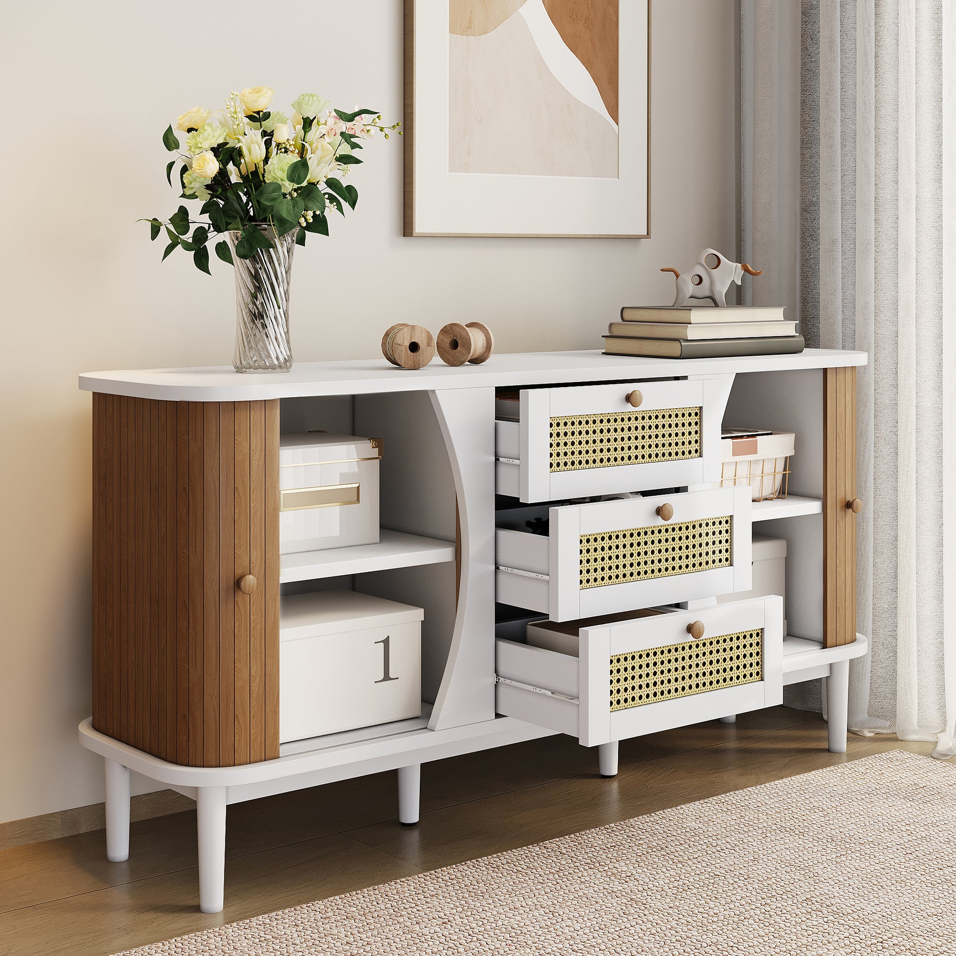 Sideboard, Rattan Sliding Door Chest, Adjustable Shelves, White and Wood