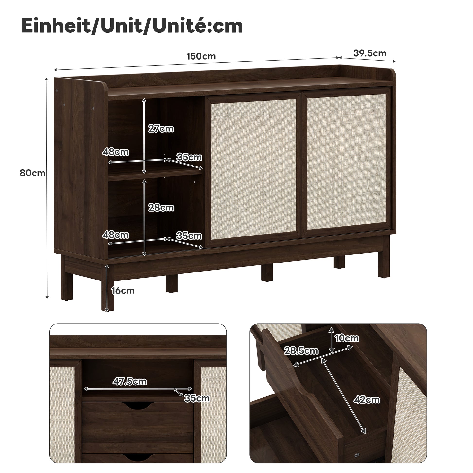 - Sliding door and double drawer storage combining concealed and visible elements