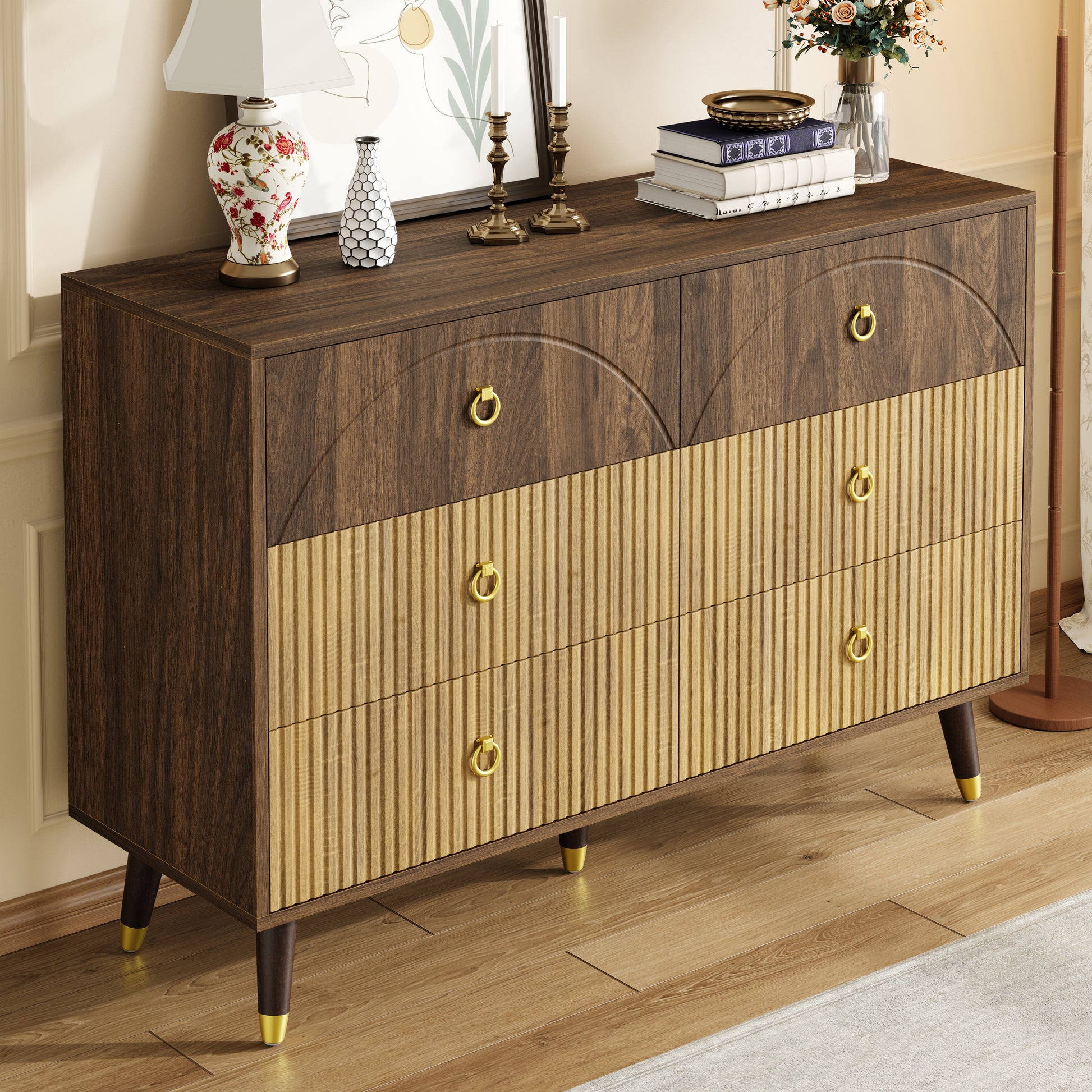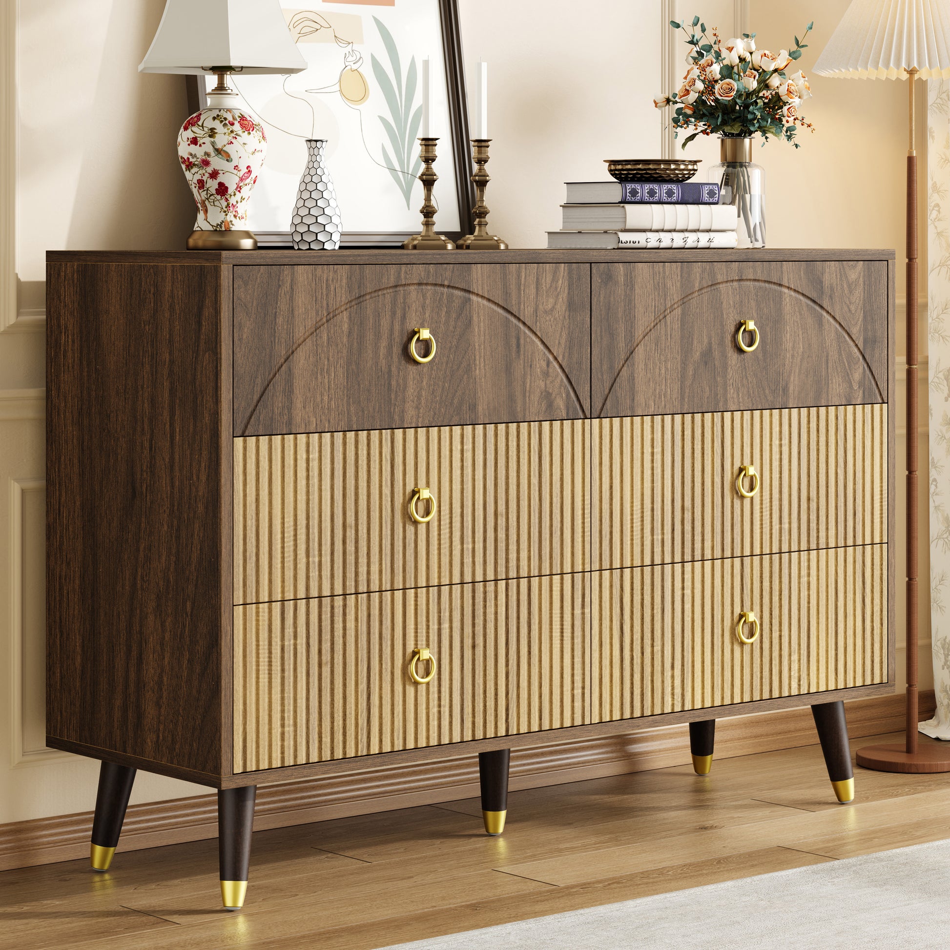 Six spacious drawers offer ample storage space for organized storage of clothing, everyday items, and other small belongings, helping to keep your home tidy. Tapered wooden legs with delicate gold caps not only ensure stability but also emphasize the lightness of the room. The generous top surface provides space for decorative objects and blends harmoniously into your interior design. Whether in the bedroom, living room, or hallway, this chest of drawers is a practical and aesthetically pleasing solution.