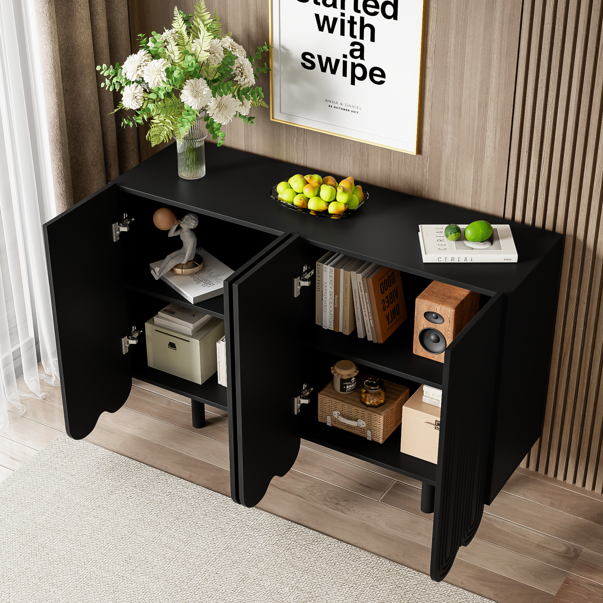 This exquisite modern sideboard combines functionality with aesthetic appeal, making it the highlight of your living room. The four doors are adorned with intricate teardrop-shaped carvings, adding an artistic touch and unique character to the room. Behind each door is a thoughtfully designed shelf, providing ample storage space to organize your belongings, allowing you to effortlessly keep your living area tidy and efficient.
