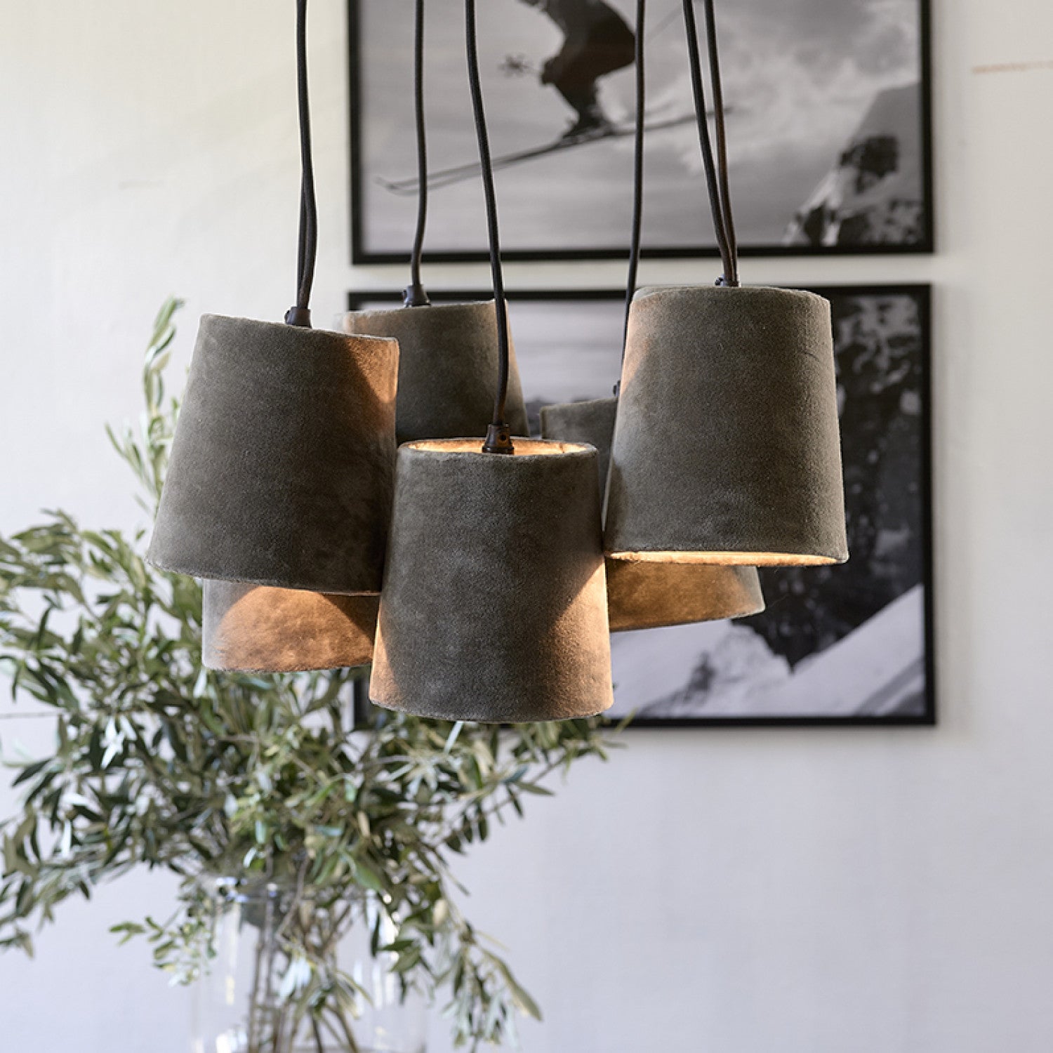 A velvety soft cluster of seven lights forming a ceiling lamp. The caps are made of grey velvet, so they go anywhere. Don't hang it too low, or everyone will want to stroke it…