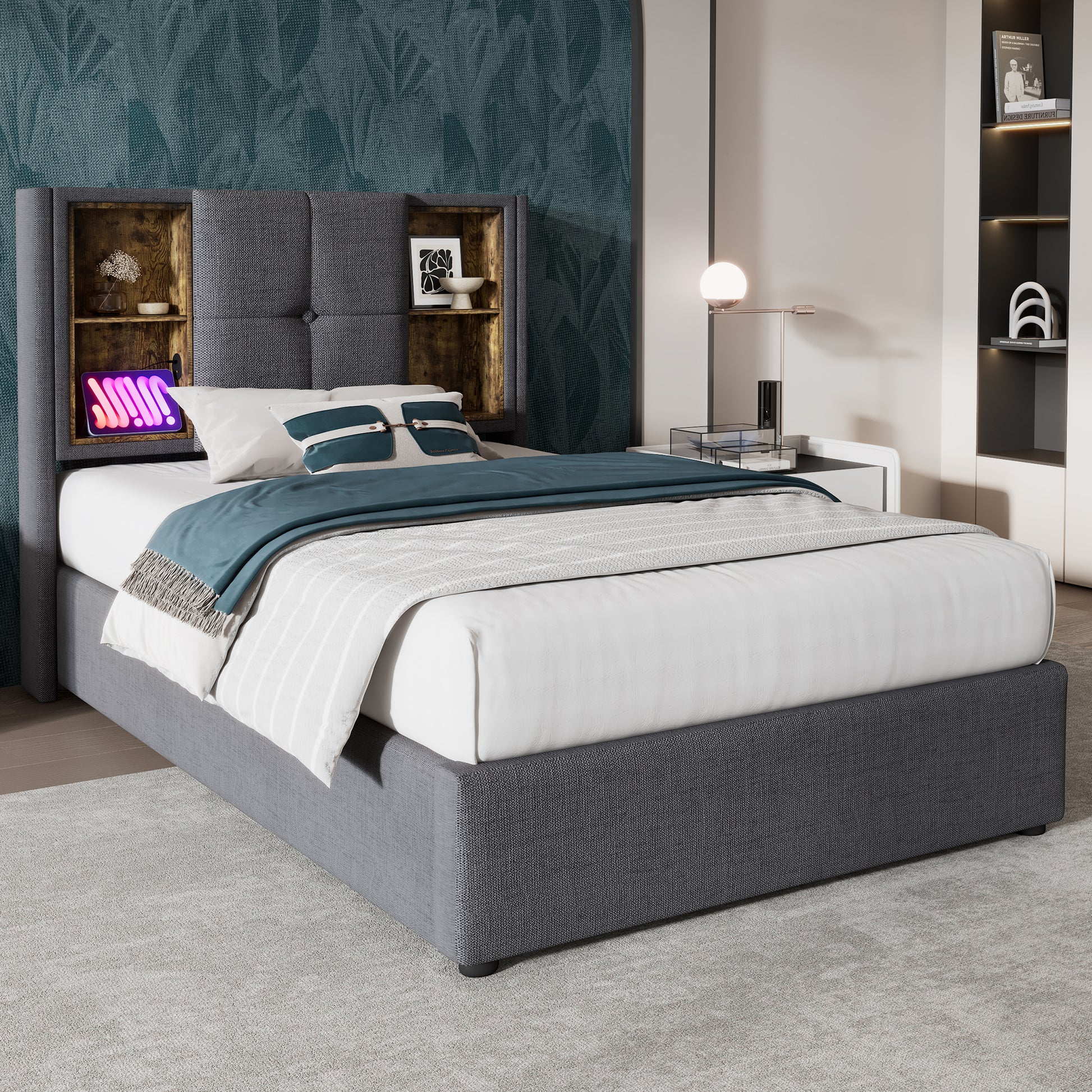 Single Bed with Wireless Charging & Storage, 90x200cm, Grey Cotton