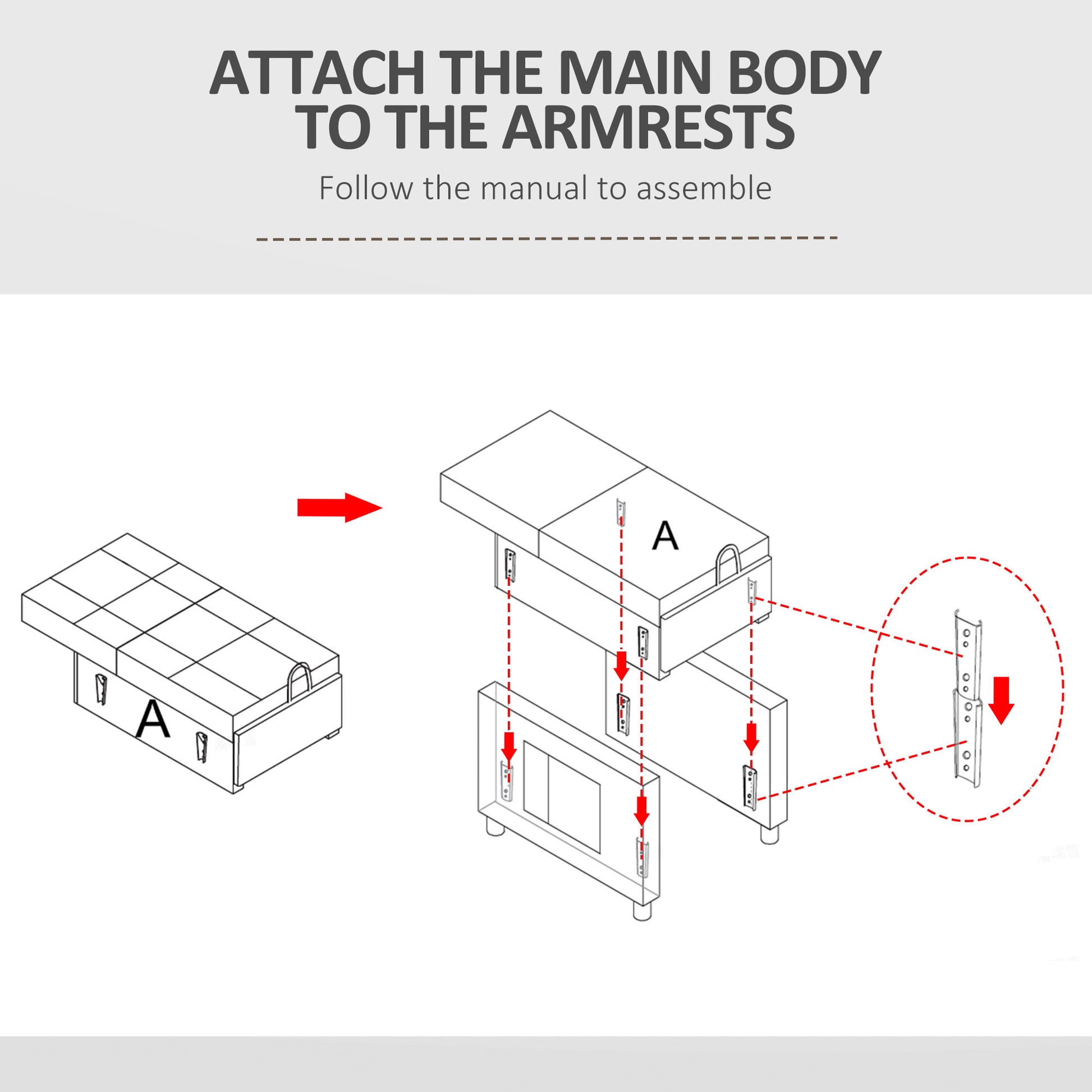 Dimensions are as follows: Chair - 85H x 69W x 82Dcm. Bed - 45H x 53W x 169Dcm. Maximum load capacity is 150kg. This chair bed is easy to assemble and made from flame retardant materials.