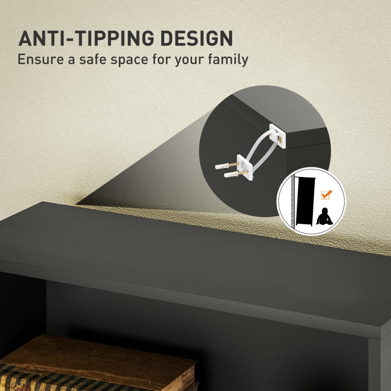 The sturdy black bookshelf is constructed from particle board, making it suitable for everyday use. Anti-tipping straps are included to safely secure the unit to a wall.