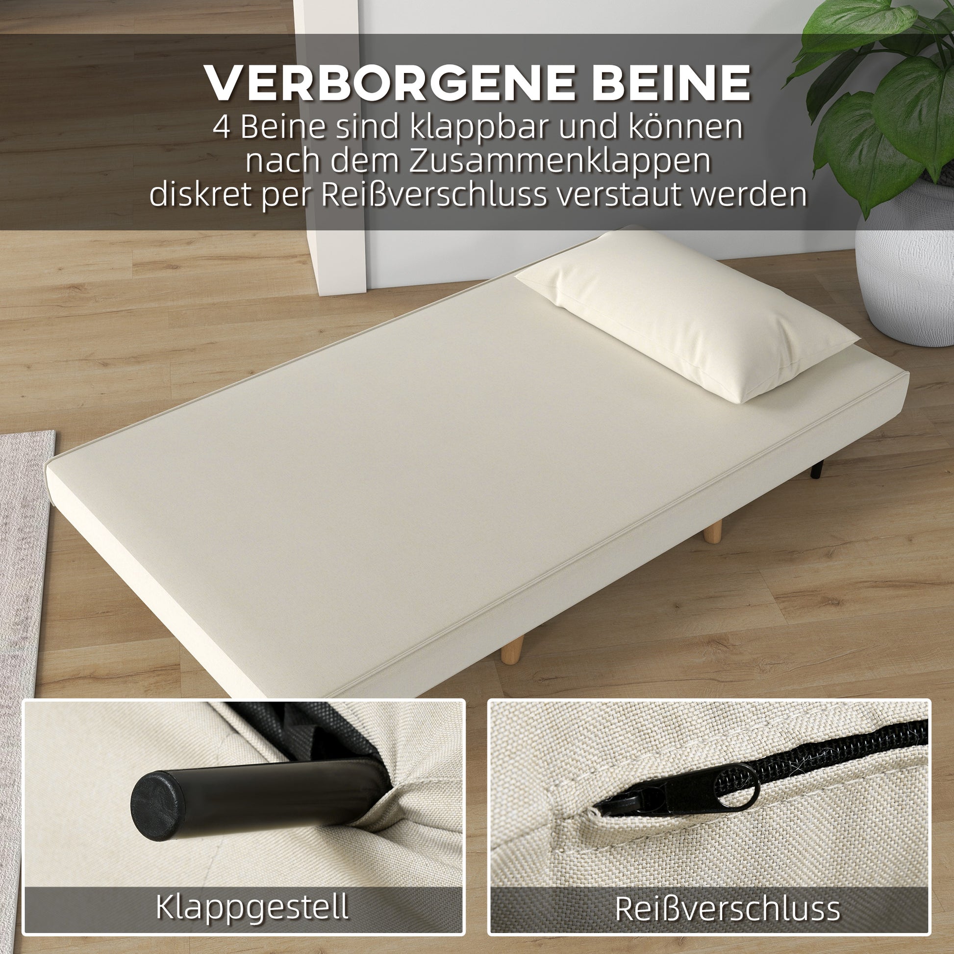 The sofa bed features 4 additional fold-out legs for added stability when lying down. They can be discreetly folded away when not in use.
