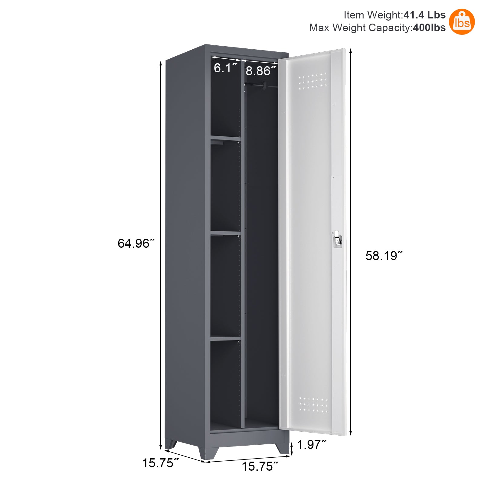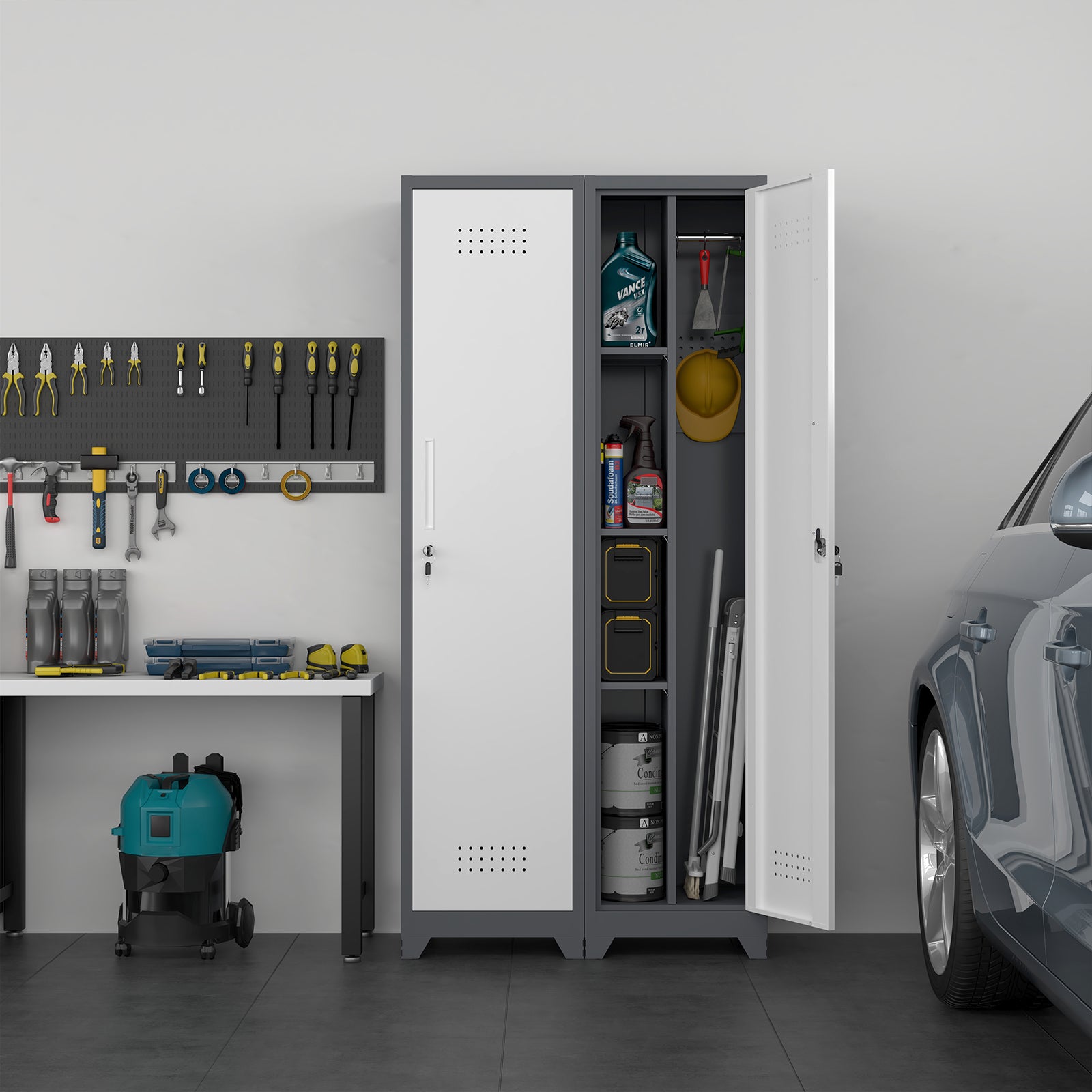 This slim broom closet storage cabinet is crafted from heavy-duty steel with a waterproof coating, offering rust-resistant performance and long-lasting durability.