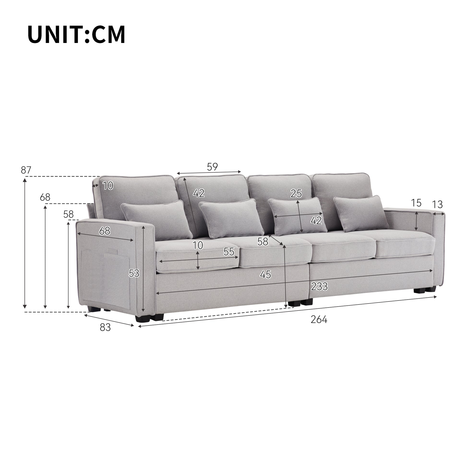 Sofa, 4-Seater with Armrest Pockets & 4 Pillows, Linen Fabric