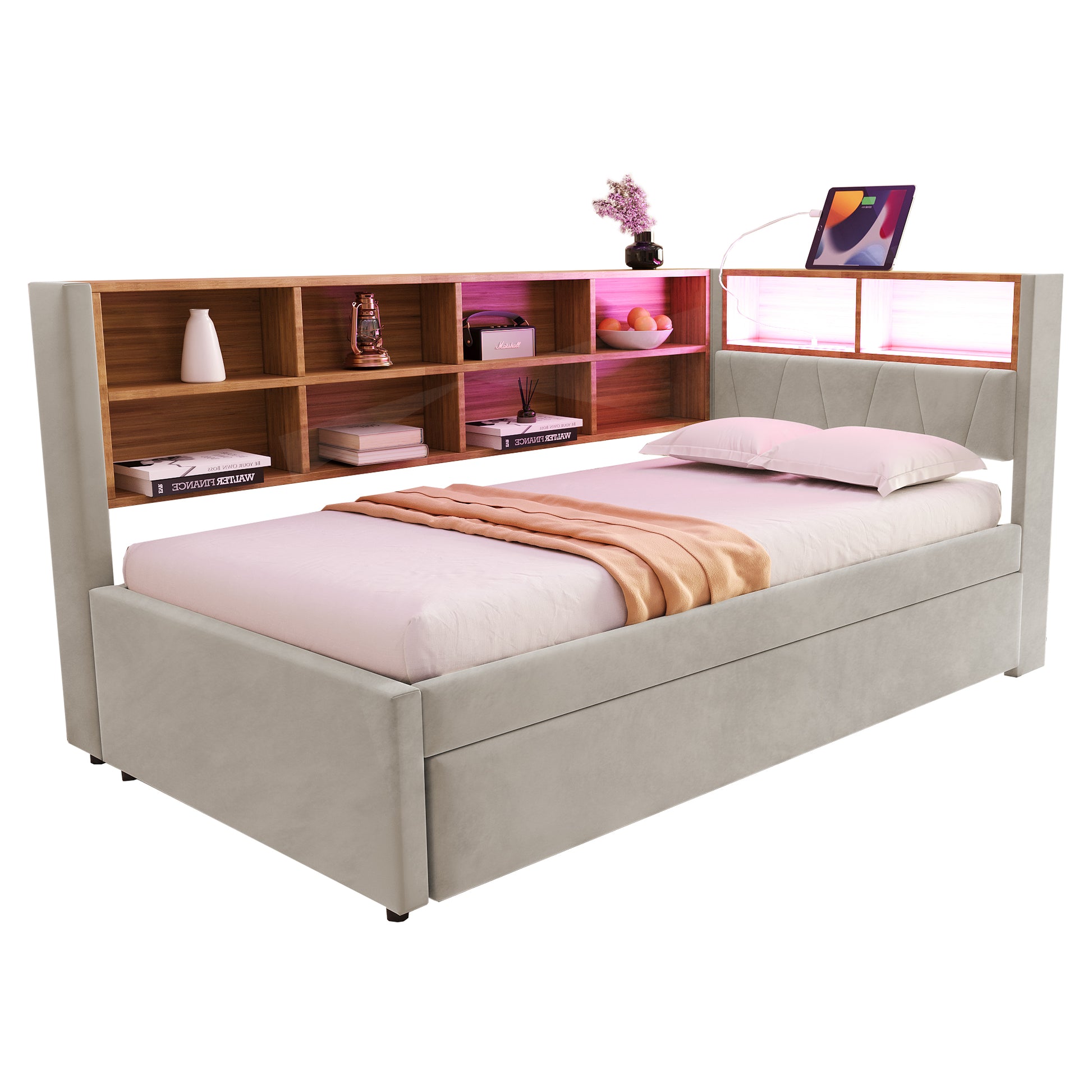 Sofa Bed 90*200, Pull-Out 90*190 with LED Lights, Sockets & Storage, Flannel Light Gray