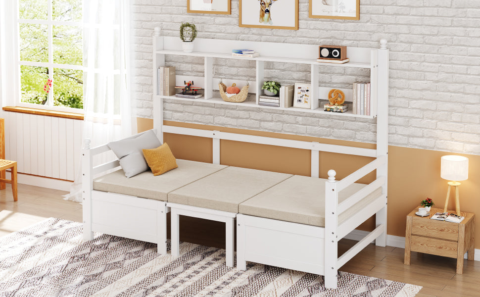 Sofa Bed, Multifunctional 2-in-1 Bed & Desk with Bookshelf & Pillows, Solid Wood White