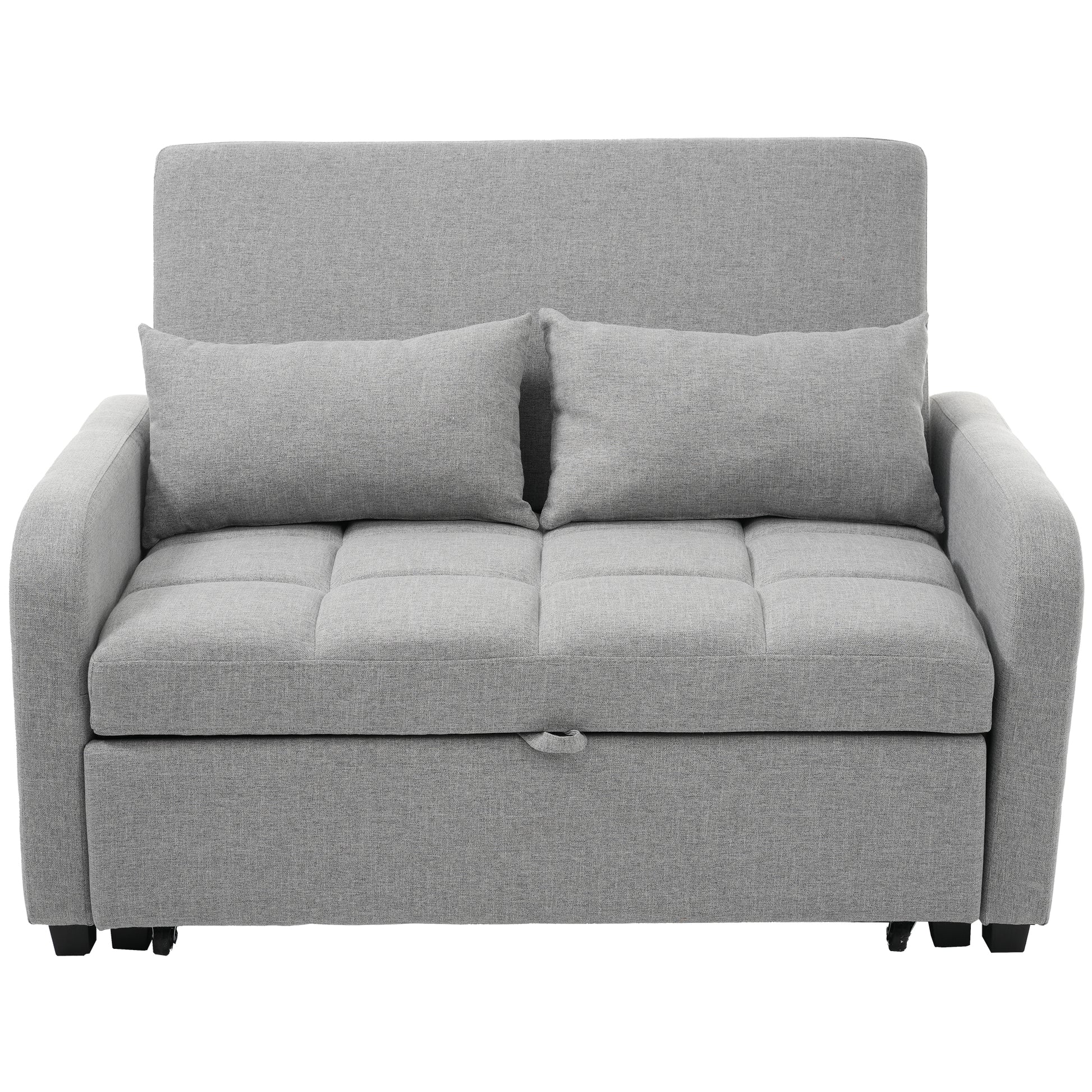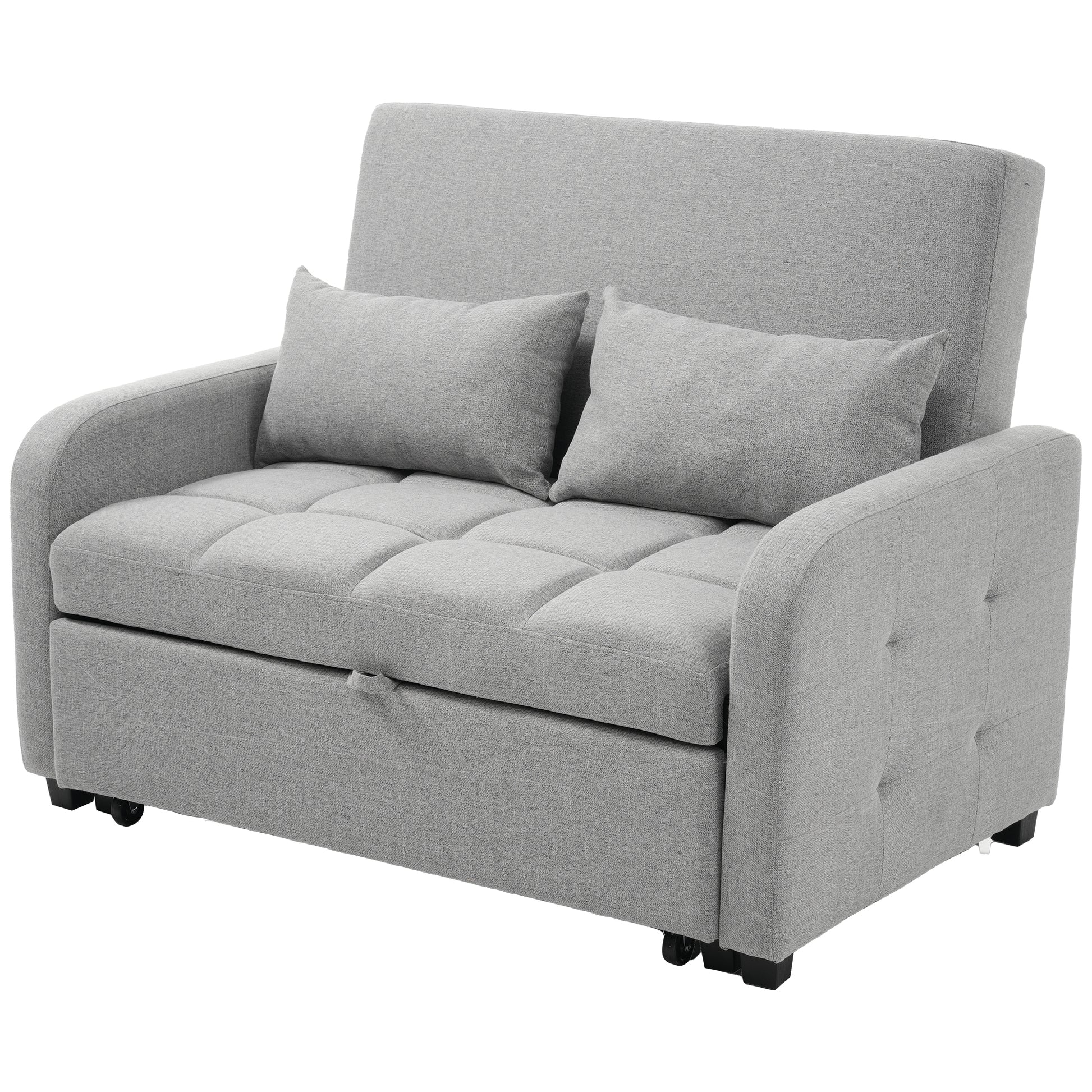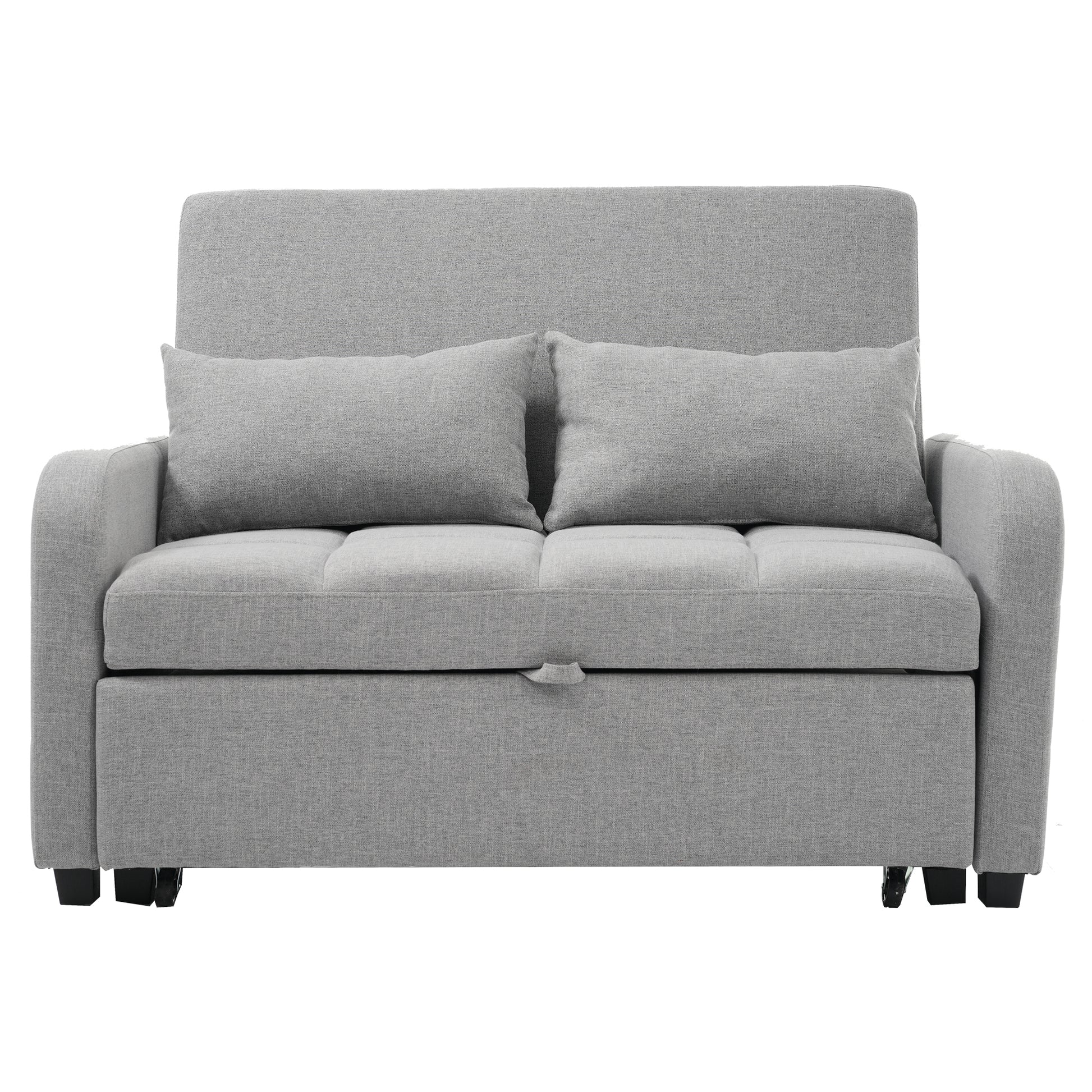 The high-quality cotton and linen surface not only feels soft and natural but is also breathable and resistant to unpleasant odors, even with extended use. The interior of the sofa bed is filled with high-density foam for maximum comfort. The sturdy wood and metal frame makes the construction durable and ensures a long service life. It has the relaxing function of a sofa but can be easily converted into a bed when needed by pulling the casters, making it particularly suitable for small apartments, student dorms, or other places where space is limited. The two included cushions not only provide additional support for the sofa but can also be used as pillows for the bed, providing extra comfort and an all-around pleasant experience.