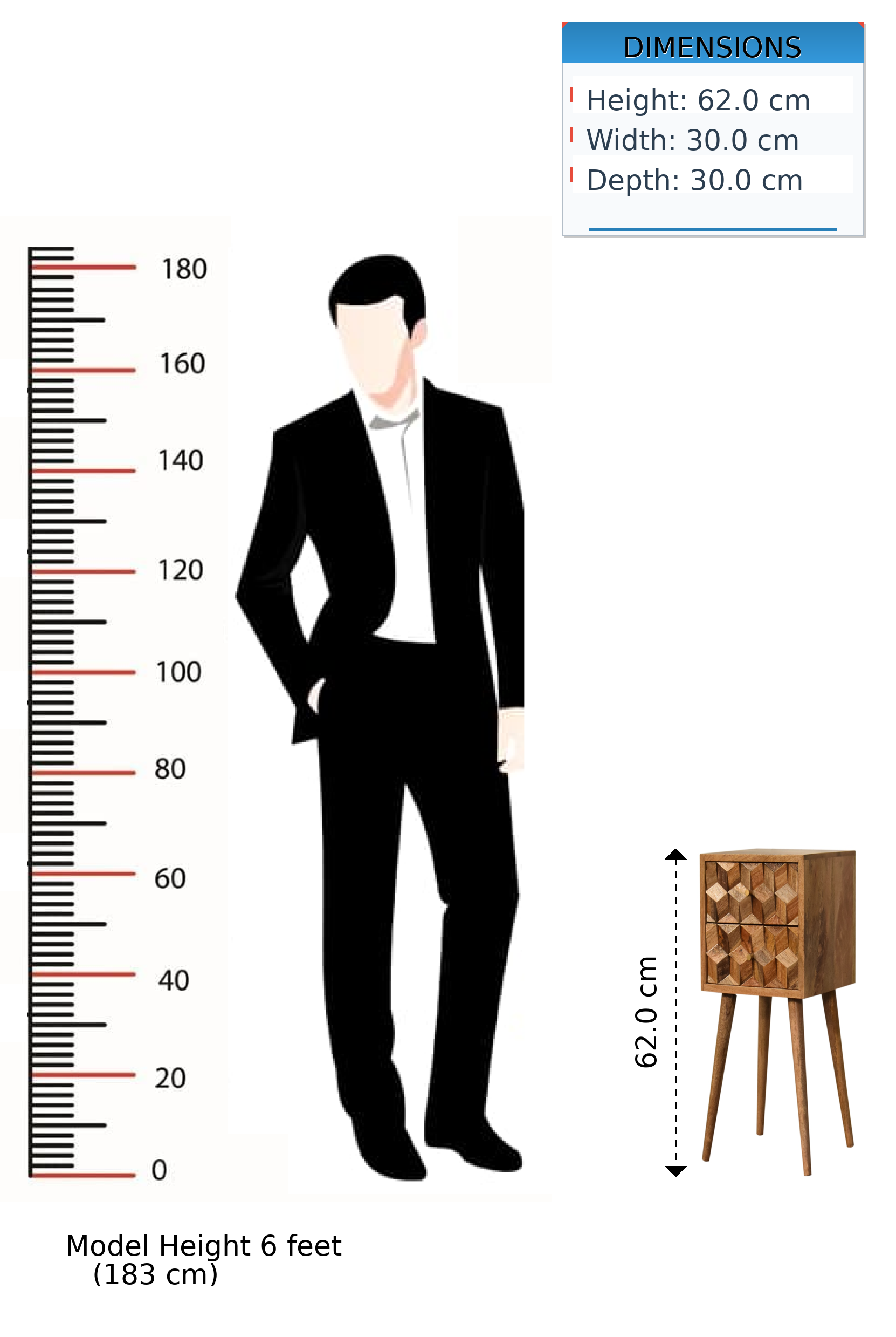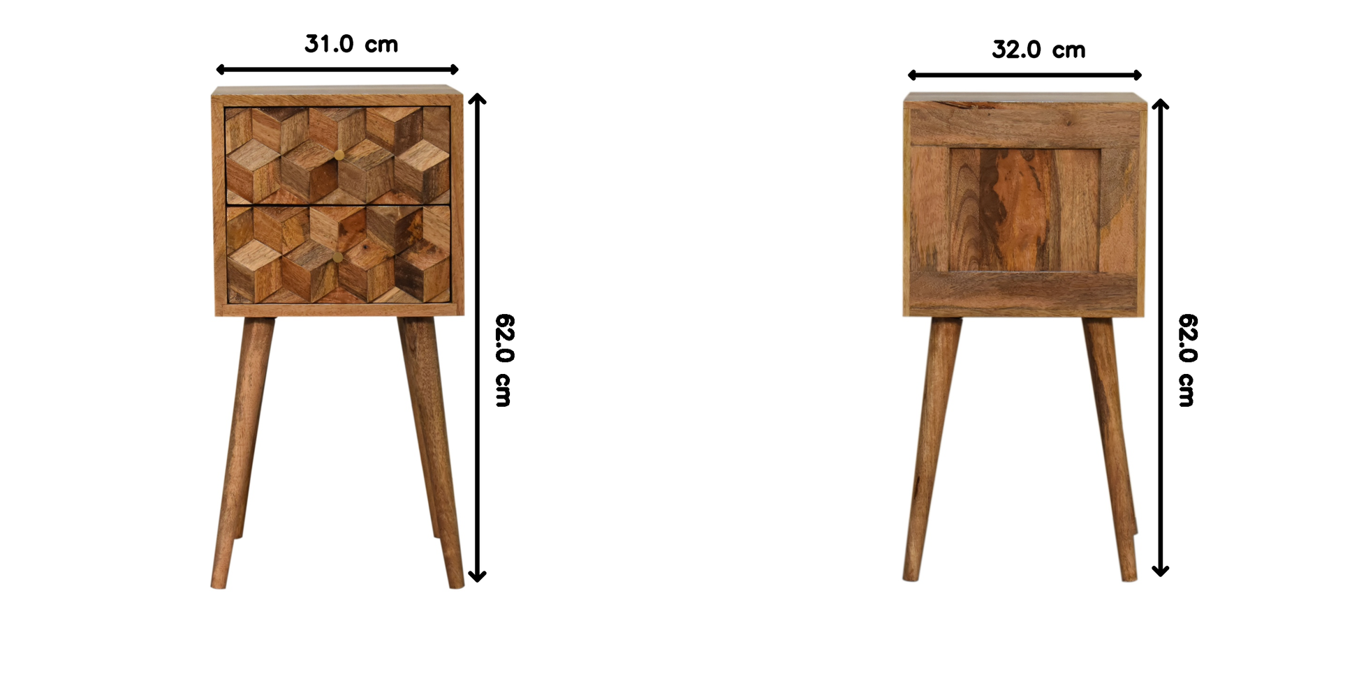Solid Wood Mini Cube Carved 2 Drawer Bedside, Brown
