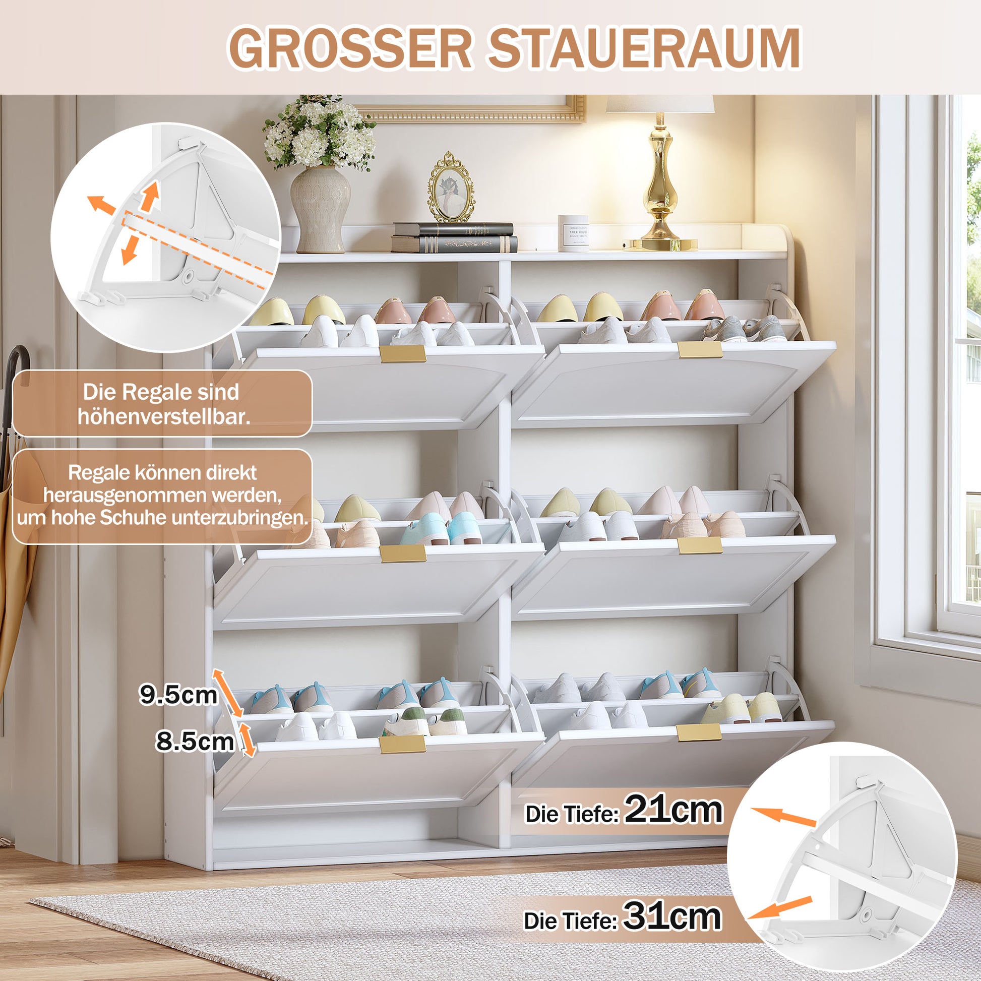 Space-Saving Tall Shoe Cabinet 6 Drop-Down Compartments Freestanding White