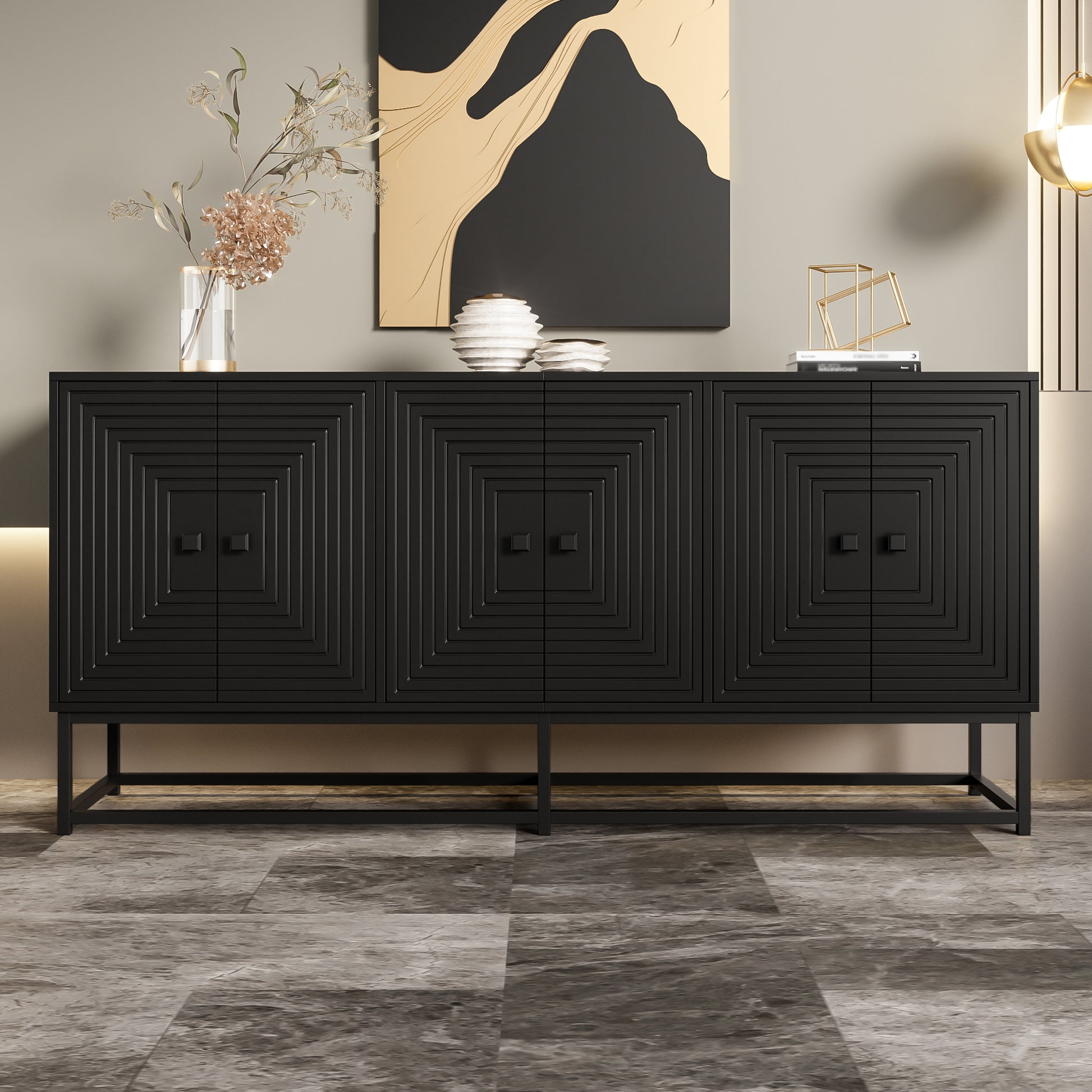The design is characterized by a deep black finish and artistic, multi-layered relief structures on the doors. The finely crafted lines create elegant shadow effects depending on the light, giving the cabinet a sophisticated, modern touch. The clean, elongated lines of the cabinet's shape blend effortlessly with various interior design styles, such as Scandinavian, minimalist, or industrial. This allows the cabinet to be harmoniously integrated into existing interior design concepts.