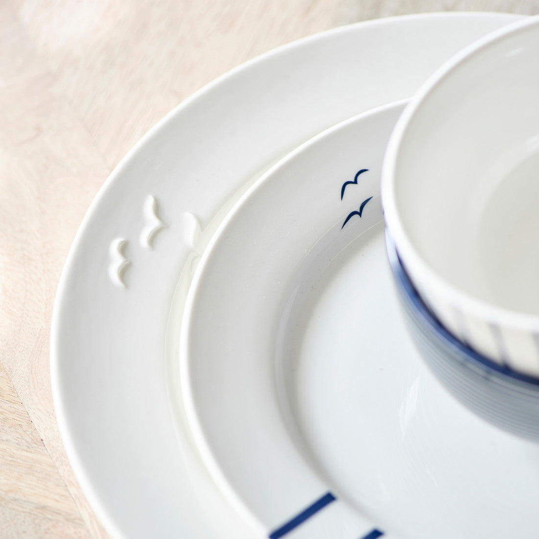 The breakfast plate is a white plate with blue details like the three birds at the top. The range was inspired by a chic German Wadden Island called Sylt and the range makes for a great combination with the Seafood Club tableware. Each plate is handcrafted and unique and is suitable for the dishwasher.
