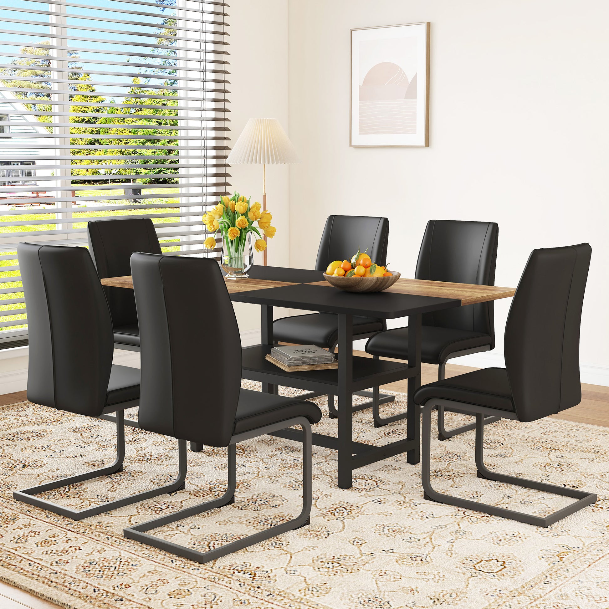 Table Set, Rectangular Dining Table, Multifunctional Shelf, 6 Armchairs, 160x90x76 cm, Black Faux Leather