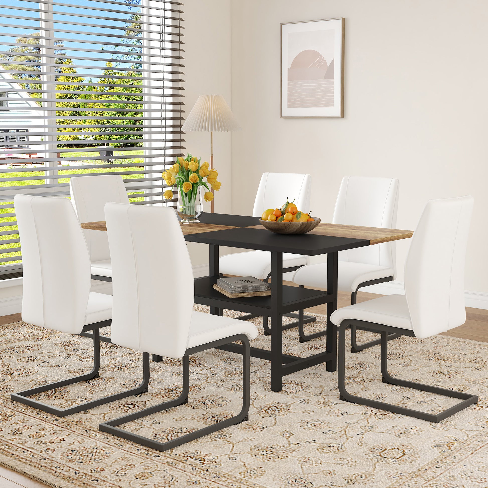 Table Set, Rectangular Dining Table with Storage Shelf and 6 Armchairs 160x90x76 cm, White Faux Leather