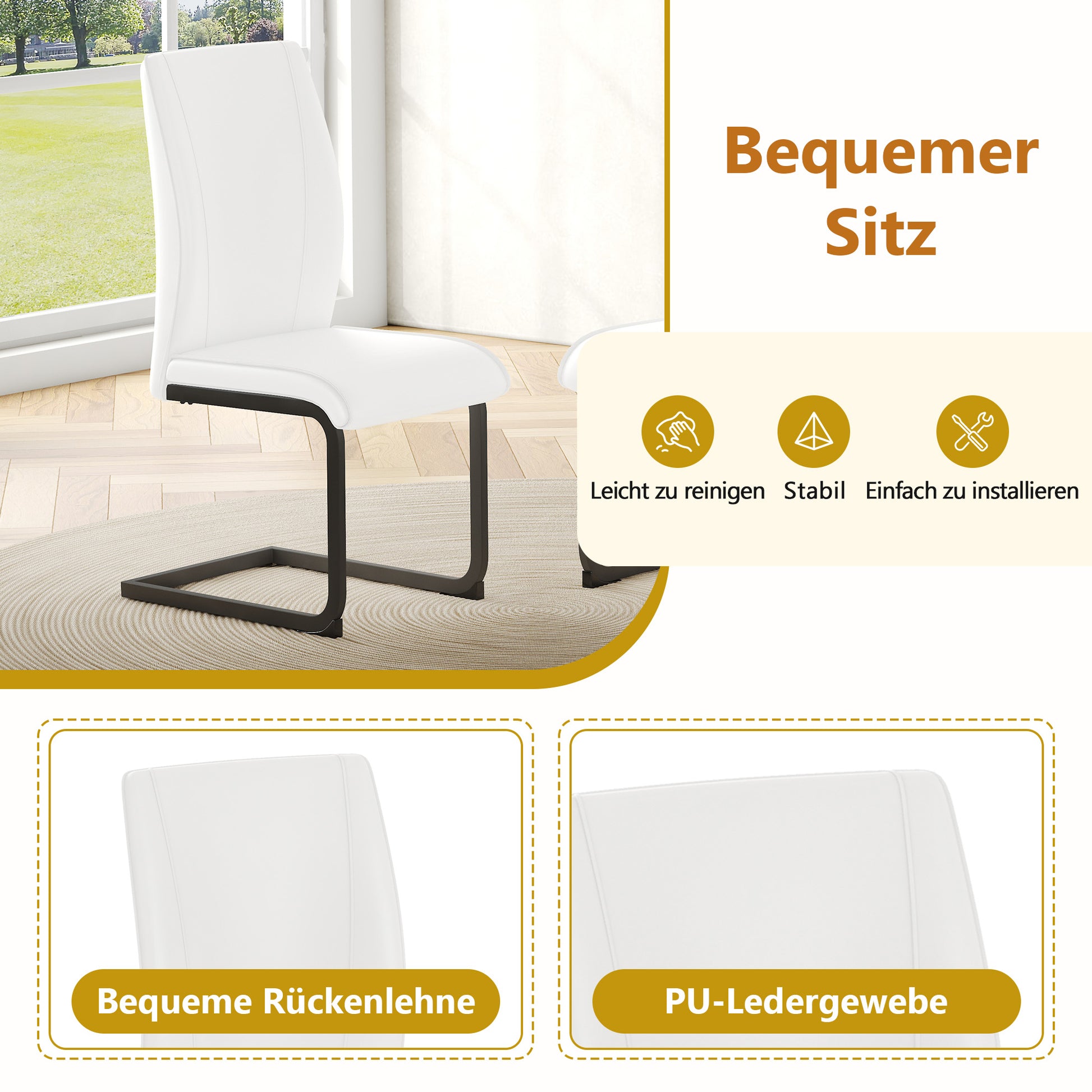 High-Quality PU Leather: The seat and backrest of the matching chairs are upholstered in skin-friendly synthetic leather that remains soft and breathable, maintaining a pleasantly dry feel even during extended periods of sitting. The easy-care surface can be easily cleaned with a damp cloth. The black metal frame ensures reliable stability thanks to its solid construction.