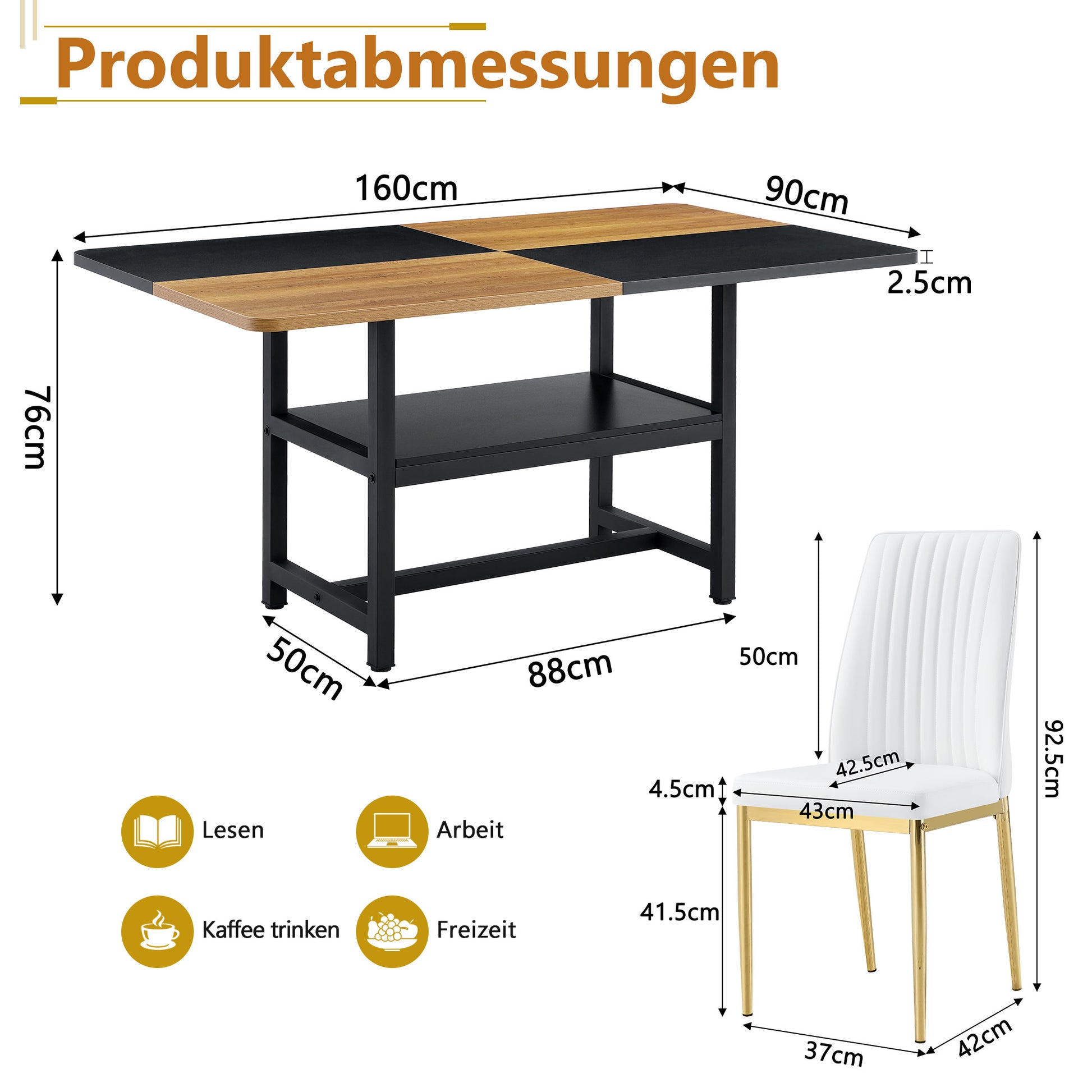 This 160 cm rectangular table set, including four white chairs upholstered in PU leather, impresses with its understated elegance. The sophisticated combination of white faux leather and gold-tone metal frames creates a harmonious, modern aesthetic. The slim metal construction lends the ensemble a visual lightness and complements interior design styles such as modern minimalism, Scandinavian design, or industrial style.