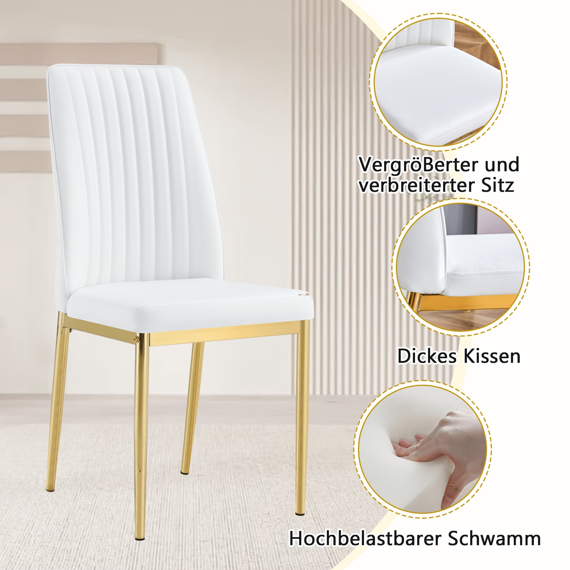 White PU leather seats and backrests harmonize with gleaming gold metal legs, instantly lending a sophisticated atmosphere to any living space—whether dining room, kitchen, or living room. The gold metal frames provide robust support, ensuring stability and durability. Each chair is designed to withstand the demands of everyday use with a weight capacity of 120 kg.