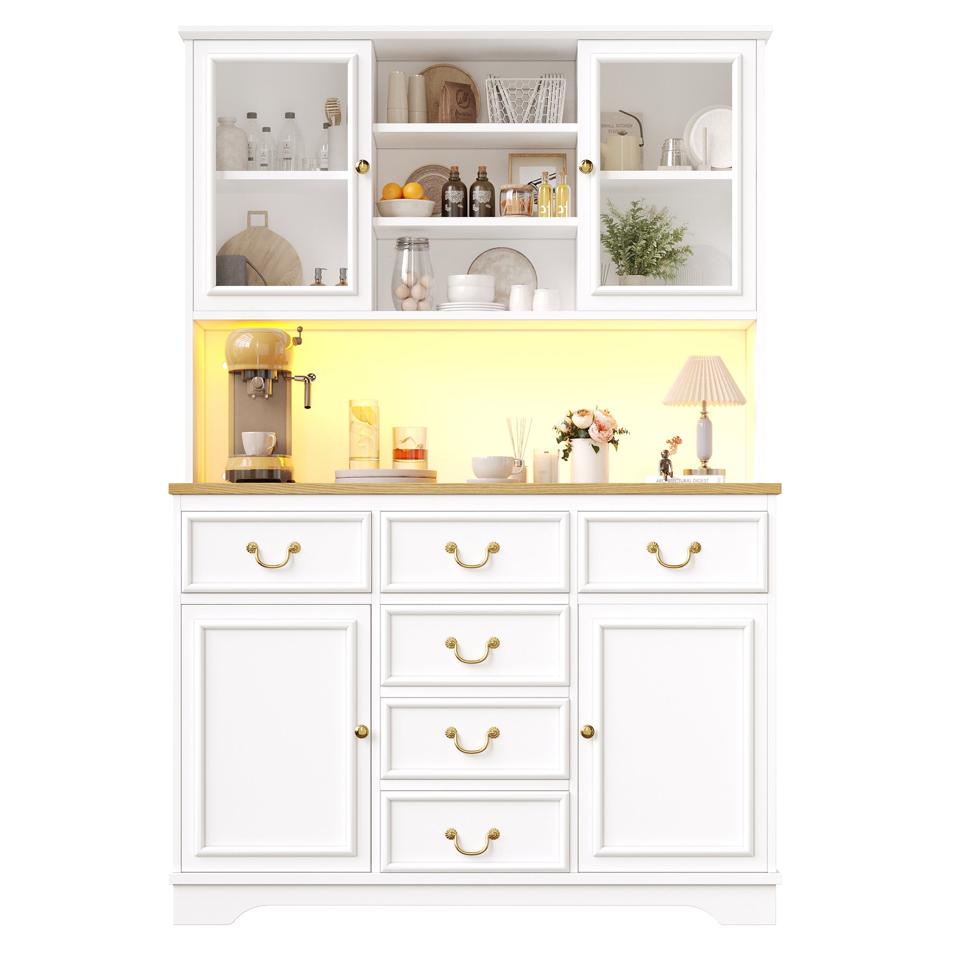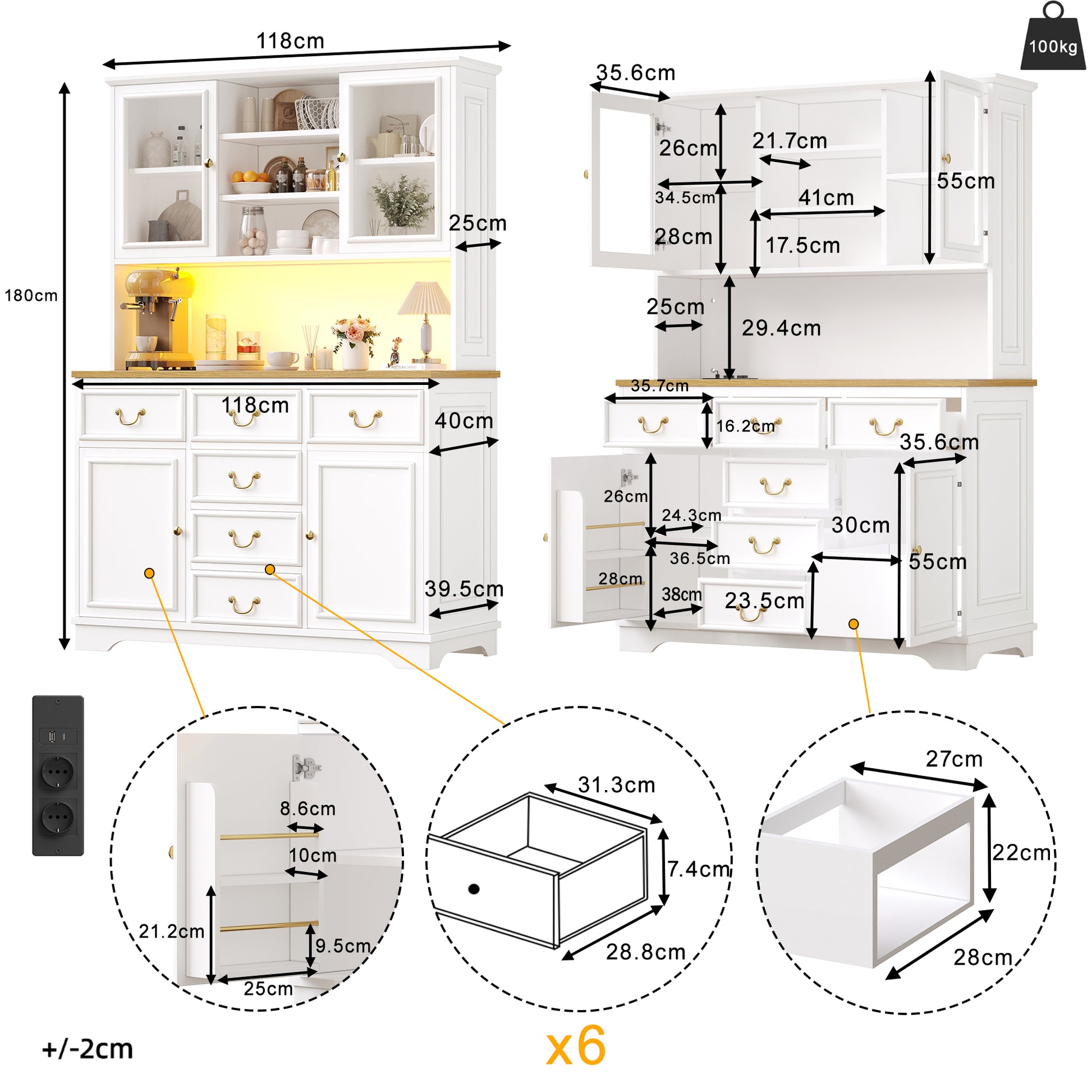Tall Kitchen Cabinet Sideboard with USB Ports, Sockets and LED Lighting, White