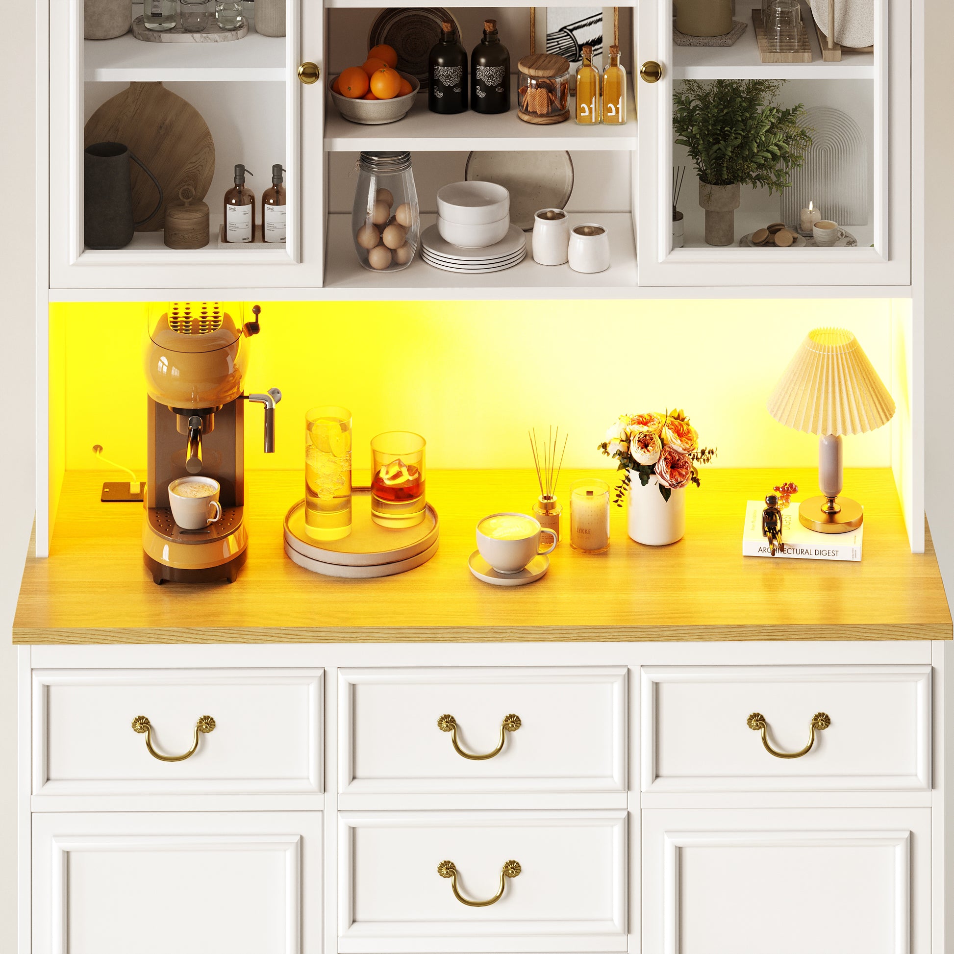 More than just storage furniture, this tall cabinet is a stylish and functional centerpiece for your kitchen. Its timeless and clean design blends seamlessly into modern interior styles and significantly enhances the room's visual appeal. The combination of high-quality materials, integrated ambient lighting, and practical elements such as the built-in power outlet makes it an indispensable workstation. It serves equally well as an efficient cooking zone, a practical bar or coffee counter, and an elegant storage center. This versatility makes it the ideal solution for improving your kitchen's functionality while transforming it into a stylish and inviting space.