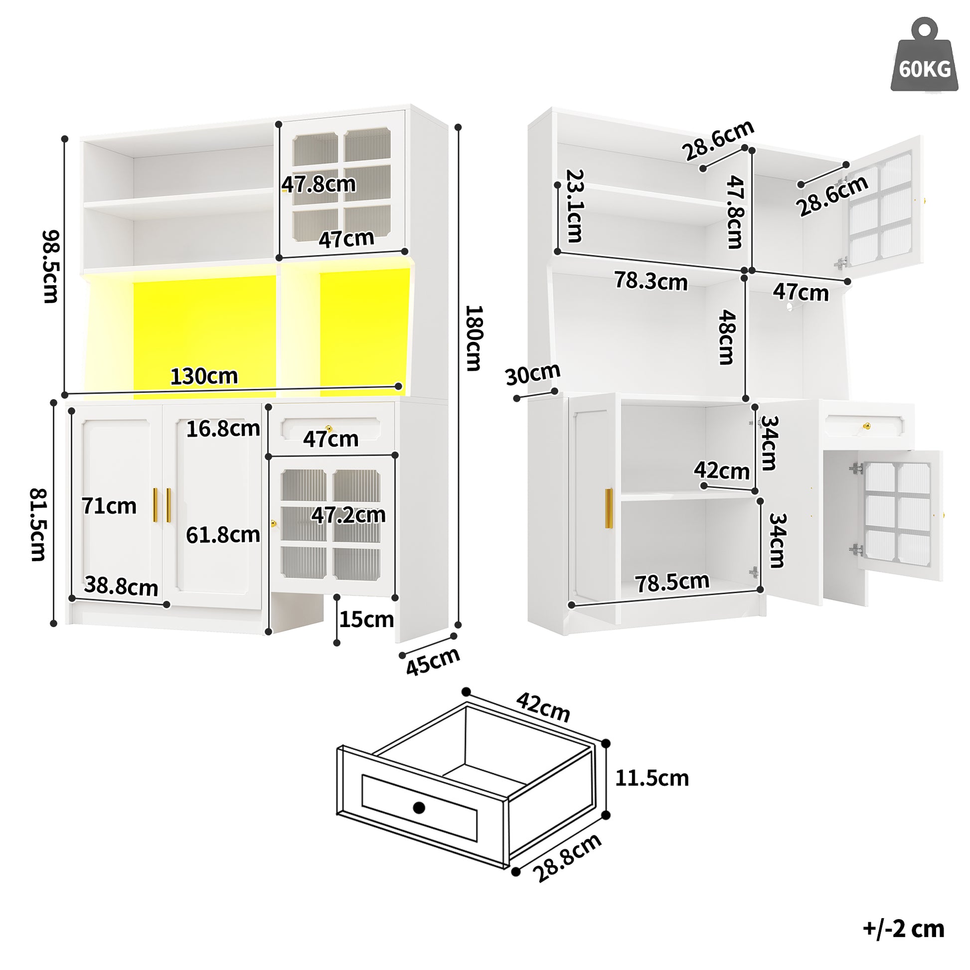 Size: 130 x 45 x 180 cm (L x W x H). Weight: 61.85 kg. Materials: MDF, PB, Metal. Maximum Load Capacity: 60 kg. Assembly Time: 45 minutes. Package Contents: Kitchen cabinets, assembled parts. Number of Packages: 3. Country of Origin: China.