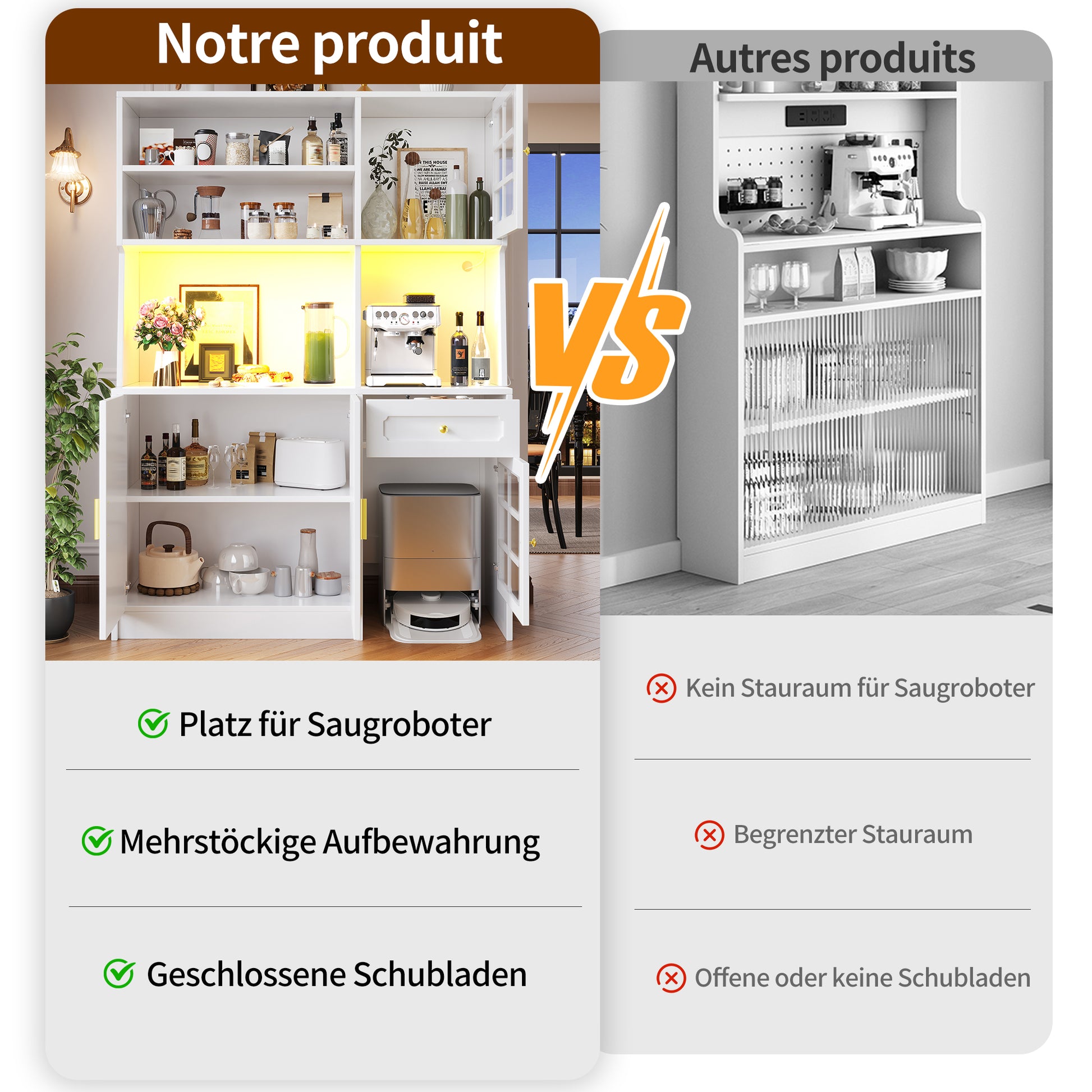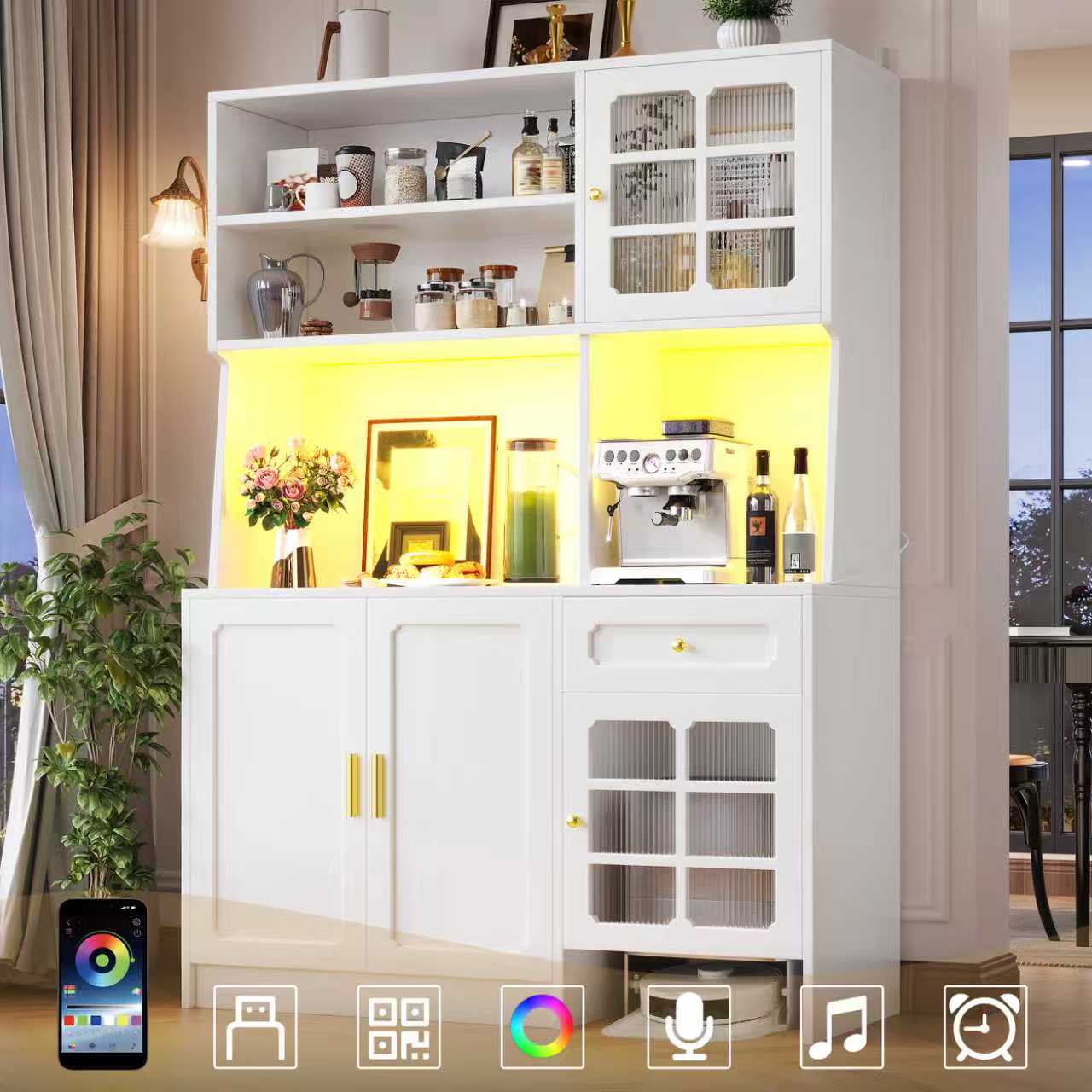 Tall Kitchen Cabinet with Glass Doors and LED Lighting, White