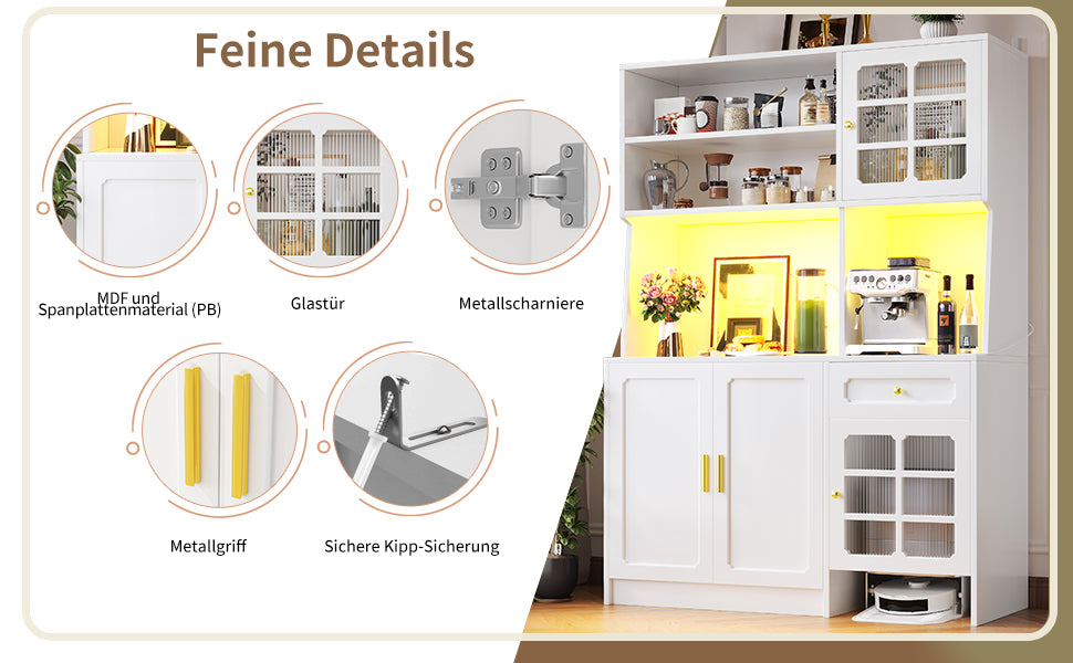 The cabinet's entirely white finish creates a subtle and elegant aesthetic. It features durable, aesthetically pleasing Changhong glass doors and classic gold handles on the cabinet doors and drawers. The overall design offers a retro feel that blends harmoniously with various interior styles.