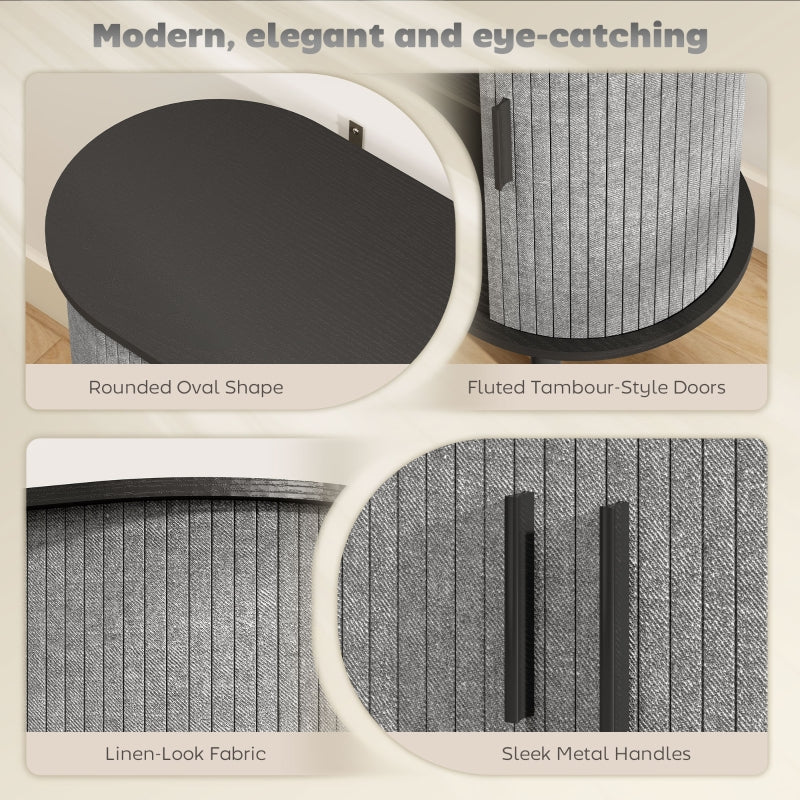 Fluted sideboard with tambour doors. The rounded oval shape and tambour-style sliding doors are covered with linen-look fabric in fluted details and feature metal handles. This design brings charm and texture to any space—modern, elegant, and just different enough to catch the eye.