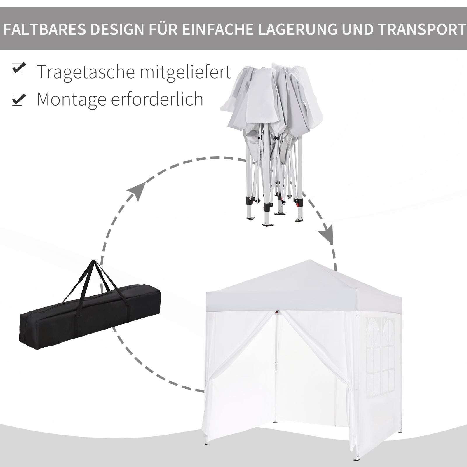 Quickly erected sunshade: Easily transportable and easy-to-assemble gazebo (2 x 2 m) with 4 removable walls for various outdoor events.