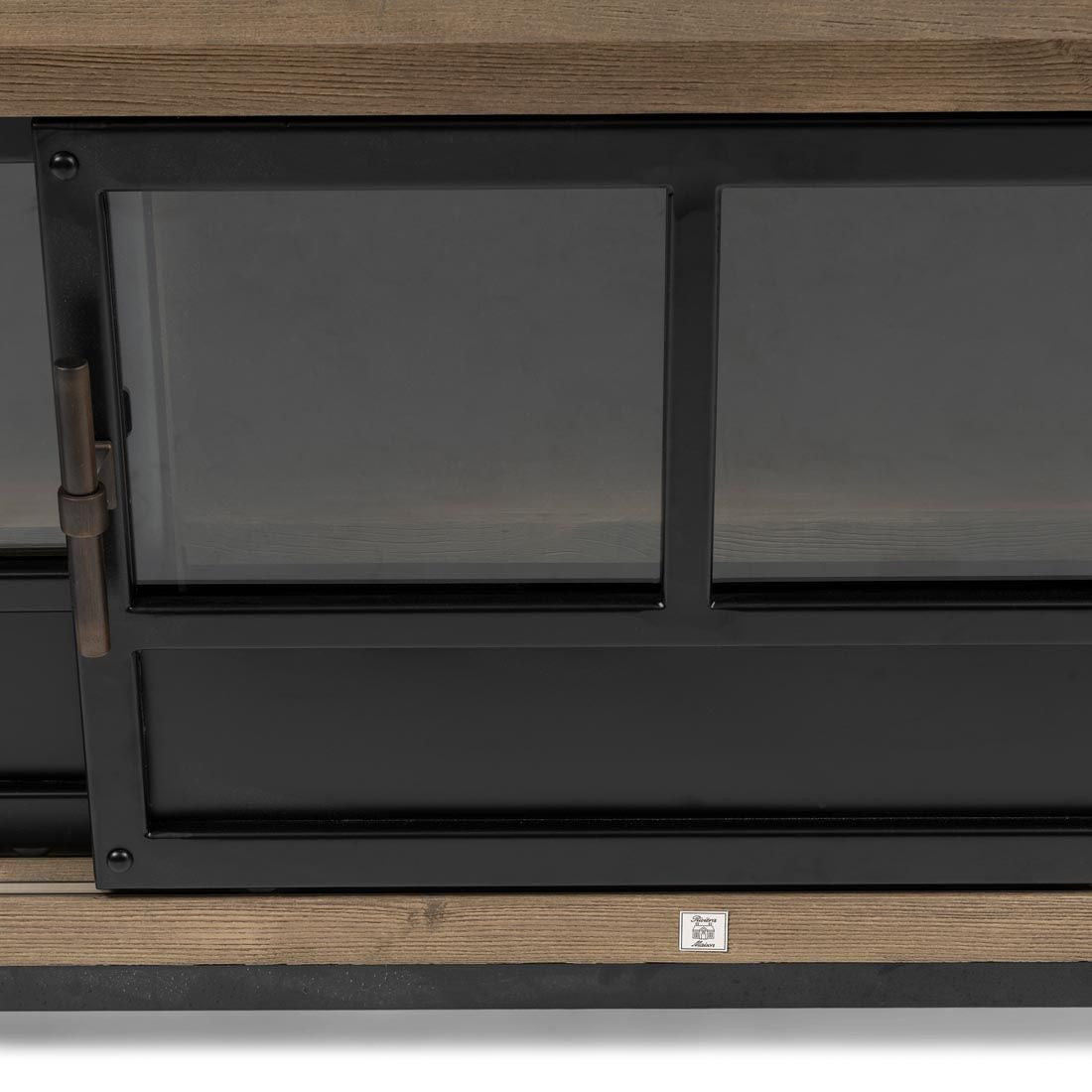Add a rugged, modern piece of furniture to your interior with the Hoxton Flatscreen dresser. This Spacious piece mixes the natural look of sturdy ash with a raw, rugged touch of black metal. This low dresser features three sliding doors with glass for storing your electronics.