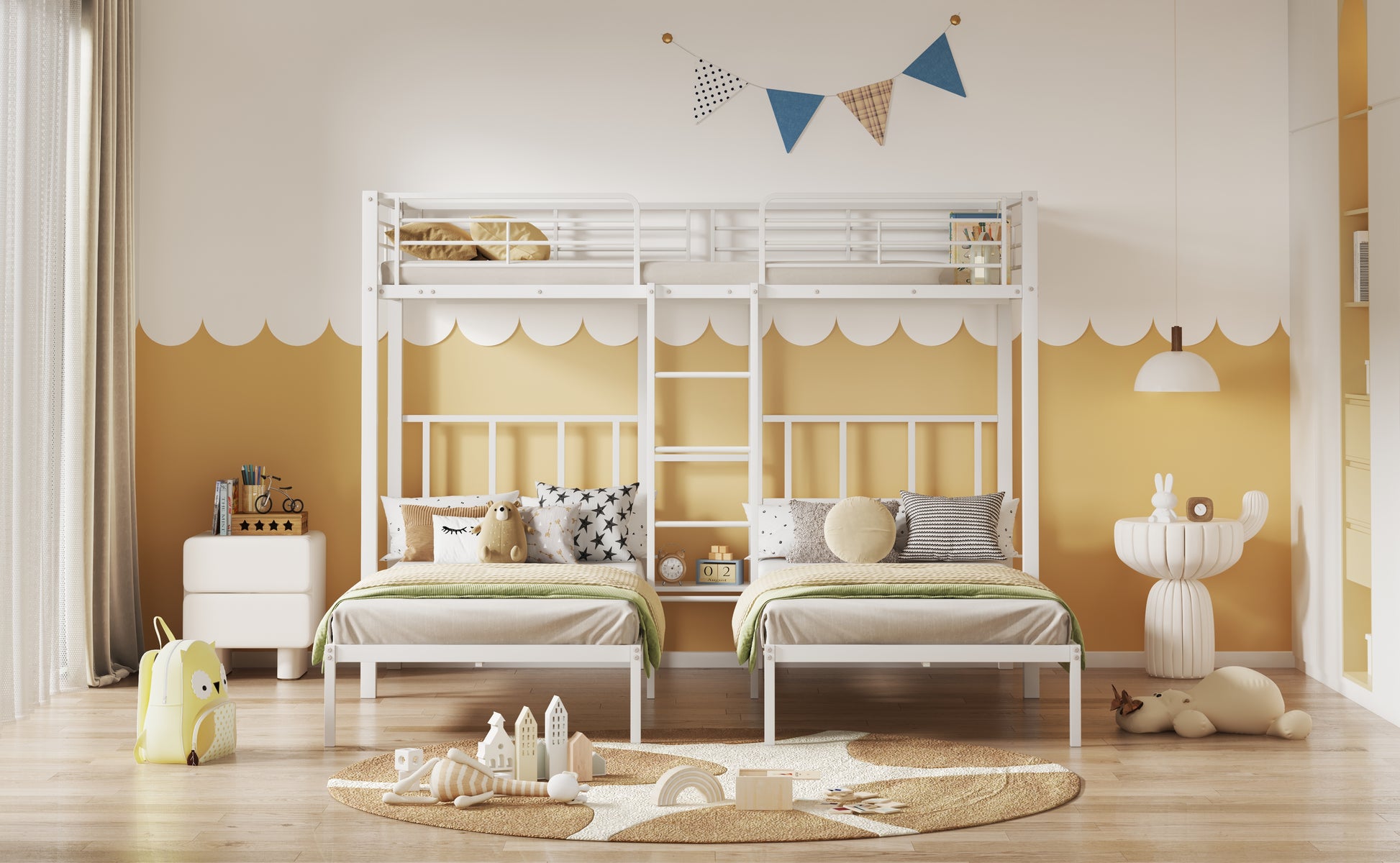 Triple Bed, Bunk Bed with Ladder, Safety Rail & Table, Iron White