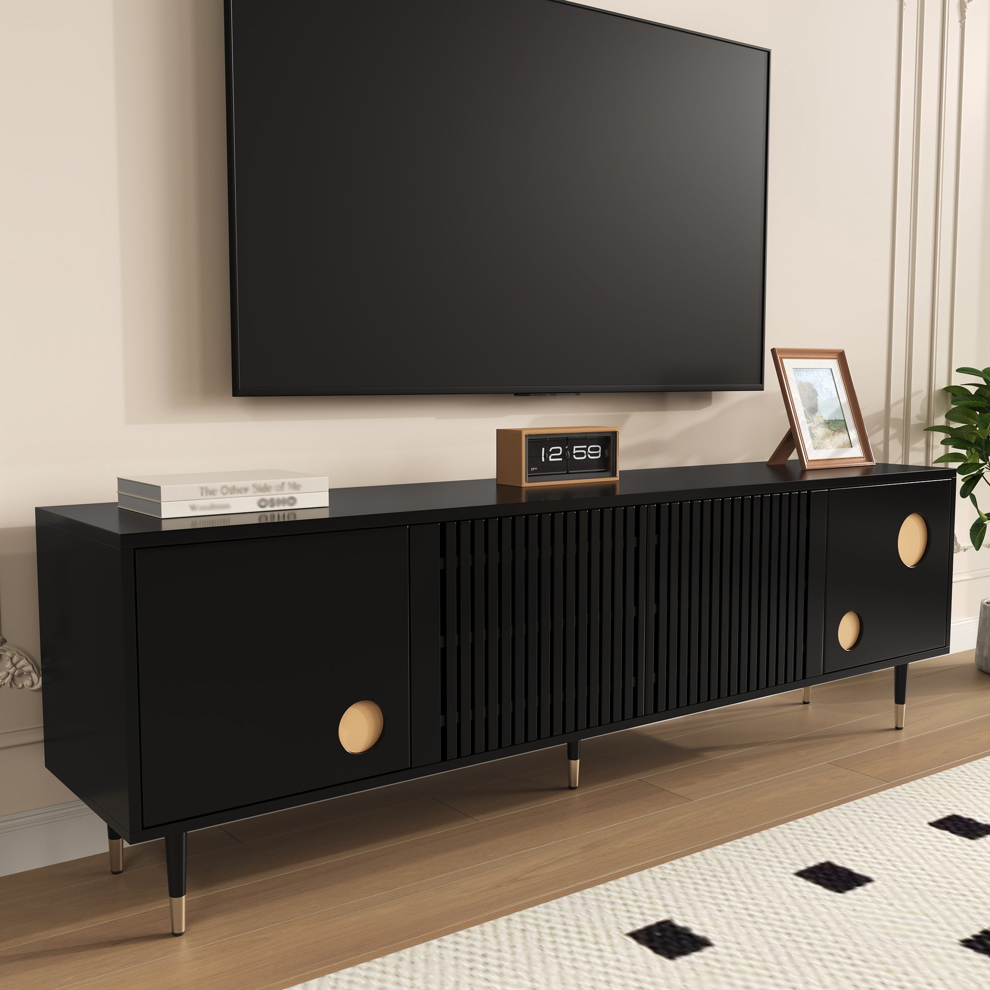 This TV stand combines elegant design with exceptional functionality, fitting perfectly into any modern home. It features four doors, two with a modern lattice design and two with gold accents, seamlessly blending classic and contemporary charm.
