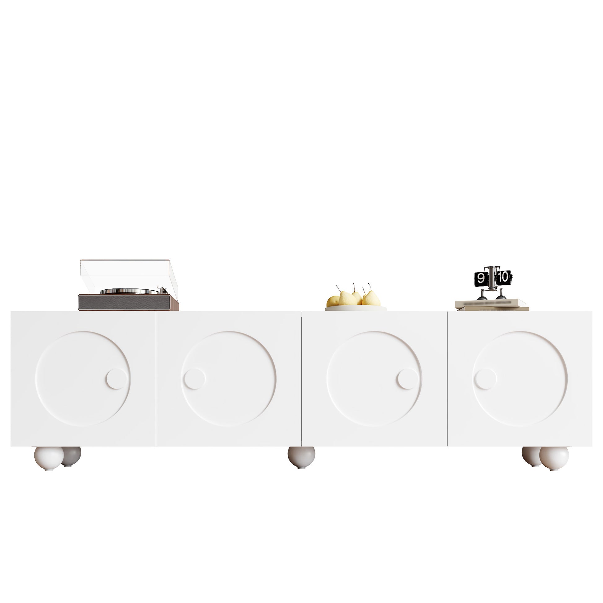 This modern, minimalist TV stand in white features three-dimensional, circularly embossed cabinet doors which, combined with the softly matte white body, create a simple yet sophisticated look. The closed doors offer ample storage space and are ideal for storing living room, dining room, or bedroom items, keeping the room neat and tidy.