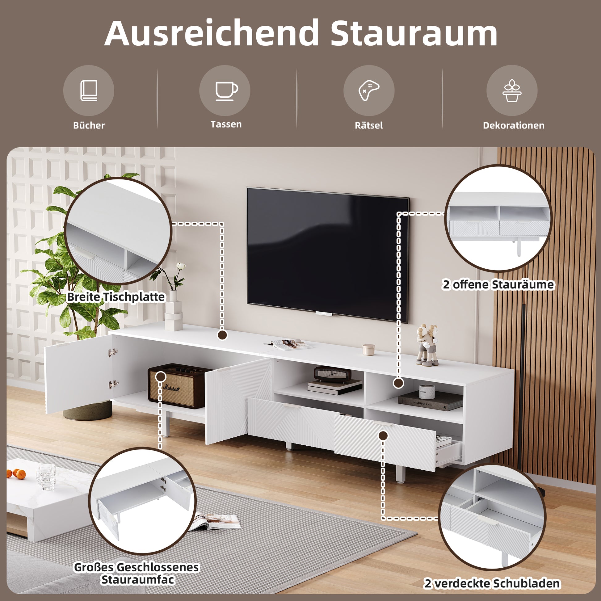 The Bohemian Irregular Stripe White TV Stand is the perfect choice for those who appreciate minimalist style. Featuring a variety of storage options and cable management, this TV stand provides an ideal solution for your daily needs, keeping your space neat and tidy. The high-quality particle board material ensures its longevity. With a width of 200cm, this TV stand is wide enough to accommodate up to a 90-inch TV, making your living room tidy and spacious while adding a unique flair.
